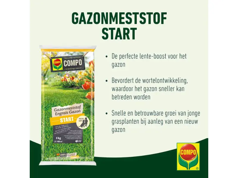 COMPO Gazonmeststof Start biedt je gazon aan de start van het tuinseizoen de perfecte boost! Als je gazon tijdens de winter is beschadigd, biedt deze meststof dé oplossing. Daarnaast zorgt het product voor een snelle en betrouwbare groei van jonge grasplanten en is dus ideaal bij het leggen van graszoden, het doorzaaien of het aanleggen van een nieuw gazon. De specifieke combinatie van voedingsstoffen, die optimaal is afgestemd op jonge grasplanten, bevordert de wortelvorming en kieming en zorgt voor een dicht, stevig gazon.