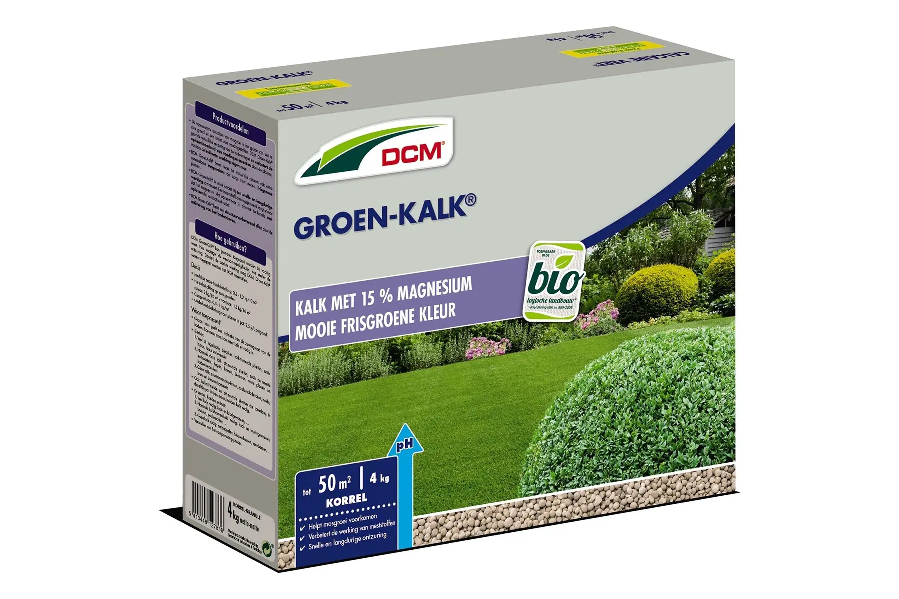 Gekorrelde magnesiumkalk (15 % MgO) voor het bekalken van gazon en siertuin. Het gaat de grondverzuring tegen waardoor mossen weinig kans krijgen. De groenkalk zorgt voor een betere voedselopname door de planten en verbetert de grondstructuur. De kalk zorgt ook voor sterkere plantencellen en steviger planten.