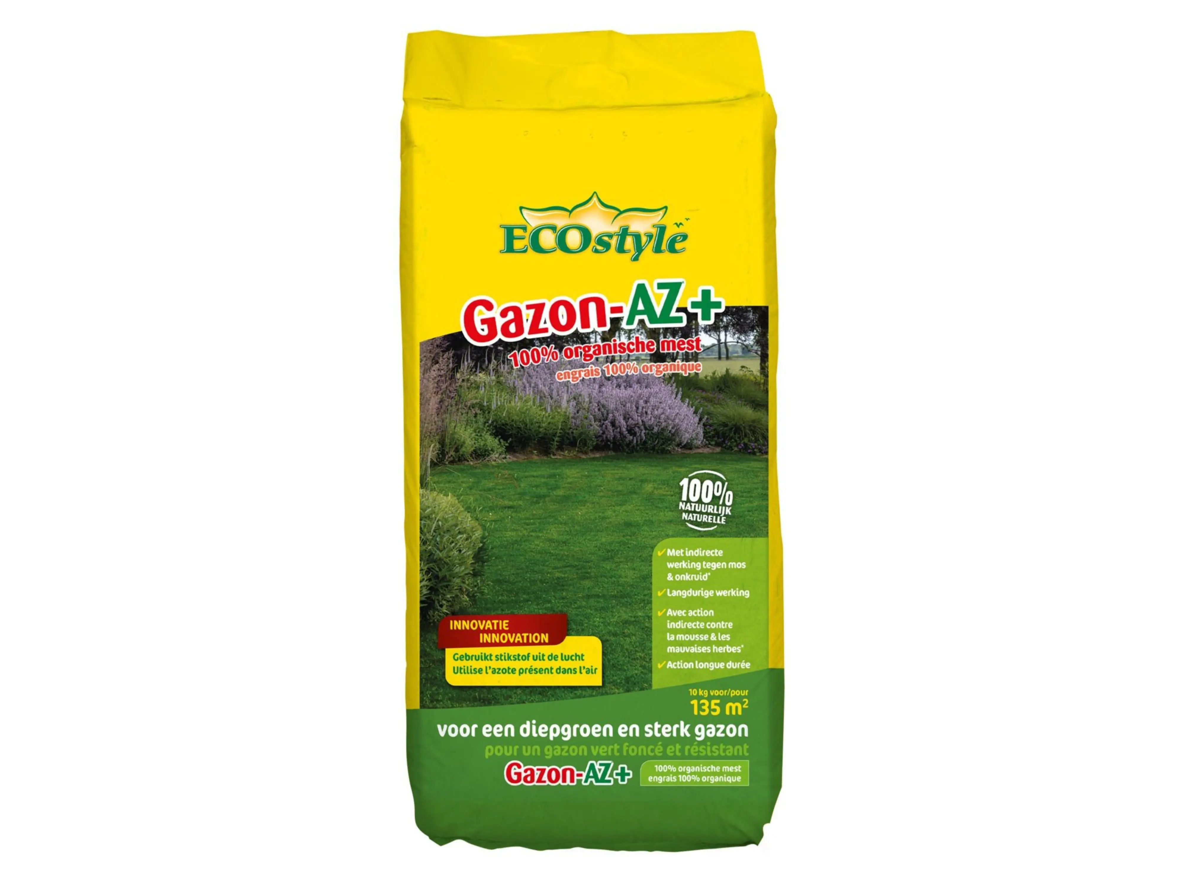 Gazon-AZ+ van Ecostyle bevat een speciale combinatie van bacteriën, schimmels en protozoa. Deze unieke mix stimuleert een gezond bodemleven en helpt het gazon sterker te groeien, waardoor mos en onkruid minder kans krijgen. De korrel is extra stevig, stuift niet en geeft je gazon voor 120 dagen een flinke boost.
