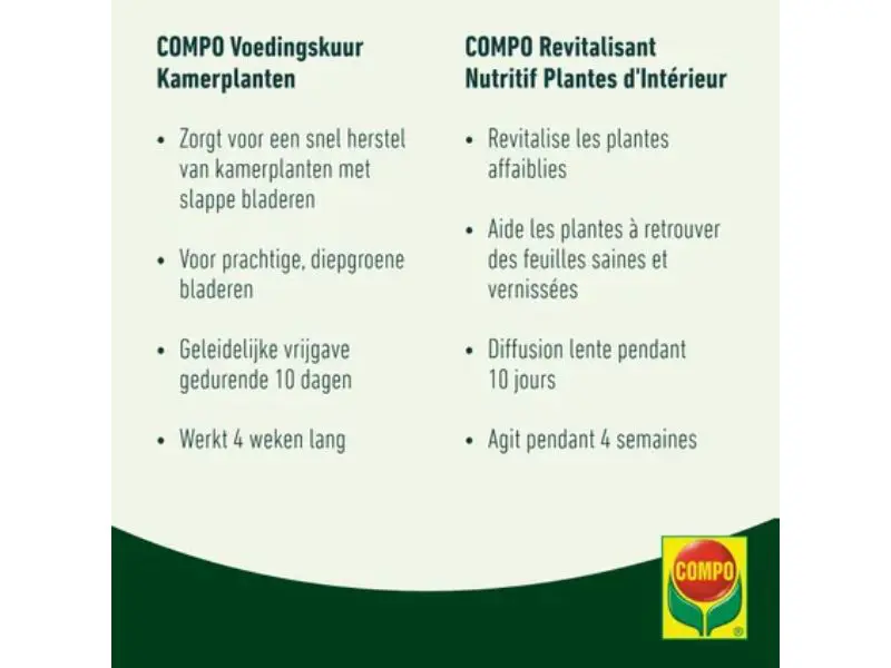 De gebruiksklare Compo herstelkuur Kamerplanten is een complete schoonheidskuur voor alle soorten kamerplanten (Ficus, rubberplant, Philodendron, yucca en varen). Het product herstelt snel verzwakte planten en bevordert de groei en bloei. Één dosis volstaat voor een kuur van 4 weken. De dosissen zijn klaar voor gebruik: doseren of vermengen met water is overbodig. De dosissen bevatten alle belangrijke voedingselementen die geleidelijk worden vrijgegeven gedurende 10 dagen.