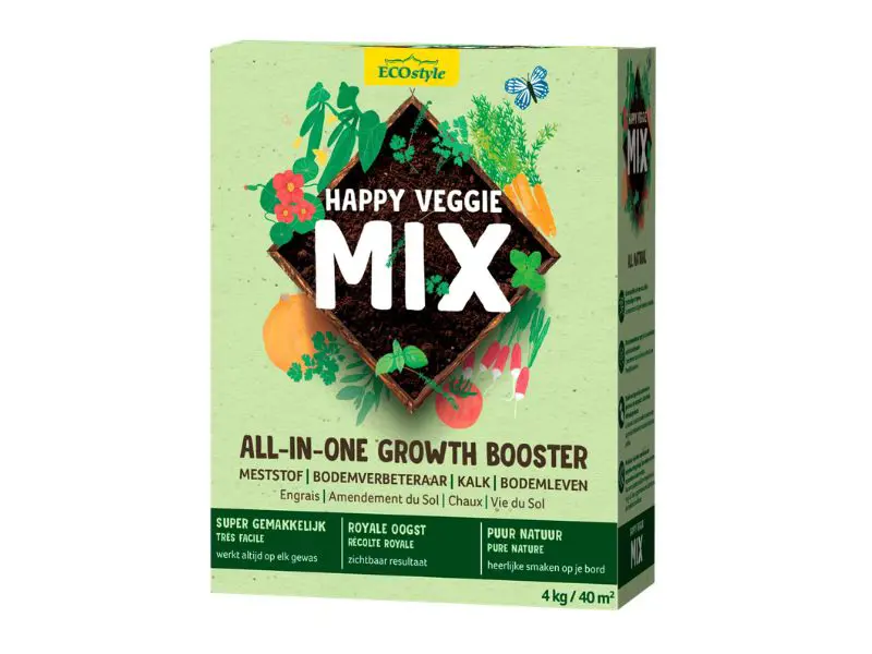 Een moestuin heb je om lekker van te genieten. Met Happy Veggie Mix van ECOstyle wordt het sowieso een succes! Het is een krachtige, natuurlijk mix van meststoffen, bodemverbeteraar, waterkalk en bodemleven. De plantaardige alles-in-één oplossing die een uitgekiende voeding voor jouw moestuin biedt en zorgt dat je bodem optimaal gaat werken. Zo geniet je bewust van jouw moestuin en eigen verbouwde, heerlijke oogst!