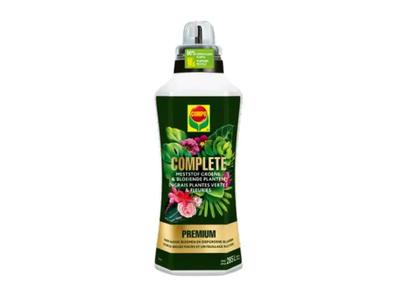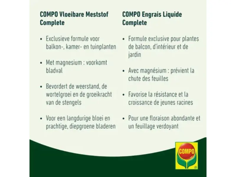 De vloeibare meststof Complete van Compo is een innovatieve voedingsrijke formule voor een betere ontwikkeling van alle groene en bloeiende planten. De extra dosis magnesium zorgt voor minder bladval terwijl het calcium zorgt voor gezonde en sterkere planten en een langdurige bloei. Daarnaast is de meststof verrijkt met ijzer voor prachtig groene bladeren.