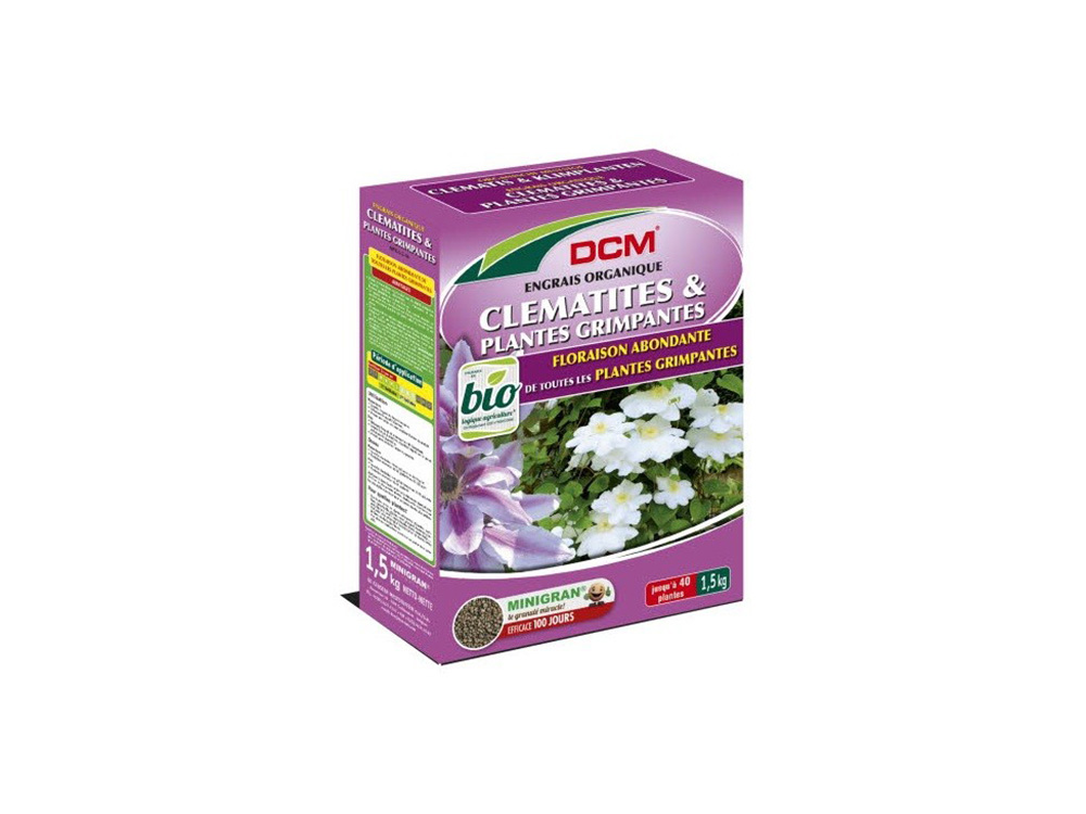 Organische meststof met de ideale samenstelling voor het voeden van clematis maar ook andere klimplanten zoals passiflora, kamperfoelie, blauwe regen, klimroos, klimhortensia, druif, hop, klimop, wingerd,… Het hoge kaliumgehalte zorgt voor sterke planten en een uitbundige bloei met intense kleuren.