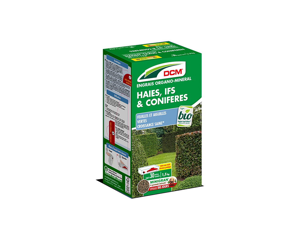 DCM Meststof Hagen, Taxus & Coniferen is afgestemd op de voedingsbehoeften van coniferen, naaldbomen, sparren, taxus en hagen. Toepasbaar in de biotuin.