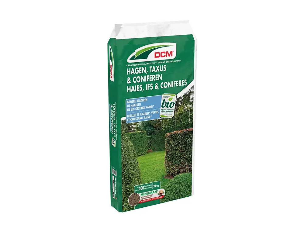 DCM Meststof Hagen, Taxus & Coniferen is afgestemd op de voedingsbehoeften van coniferen, naaldbomen, sparren, taxus en hagen. Toepasbaar in de biotuin.