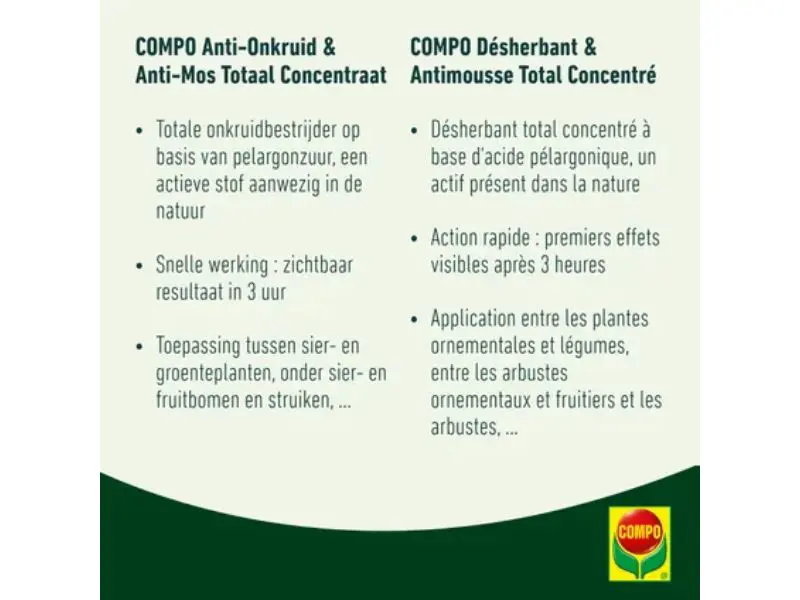 Compo Anti-Onkruid & Anti-Mos Concentraat werkt op basis van natuurlijke ingrediënten en is daardoor een milieubewuste keuze. Het product dringt bijzonder snel door in de behandelde planten, al binnen 3 uur zie je resultaat. Ook bij lagere temperaturen blijft de werking uitstekend. Je kunt het concentraat veilig toepassen tussen sier- en groenteplanten, onder sier- en fruitbomen en onder struiken. Opnieuw zaaien of planten kan al na 3 dagen.