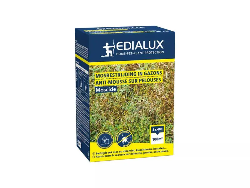 Moscide van Edialux is een wateroplosbaar poeder voor de bestrijding van mossen in gazons, grasvelden en op verharde, permanent onbeteelde oppervlakken zoals dolomiet, kiezelstenen en kasseien (niet geschikt voor tegels of beton).