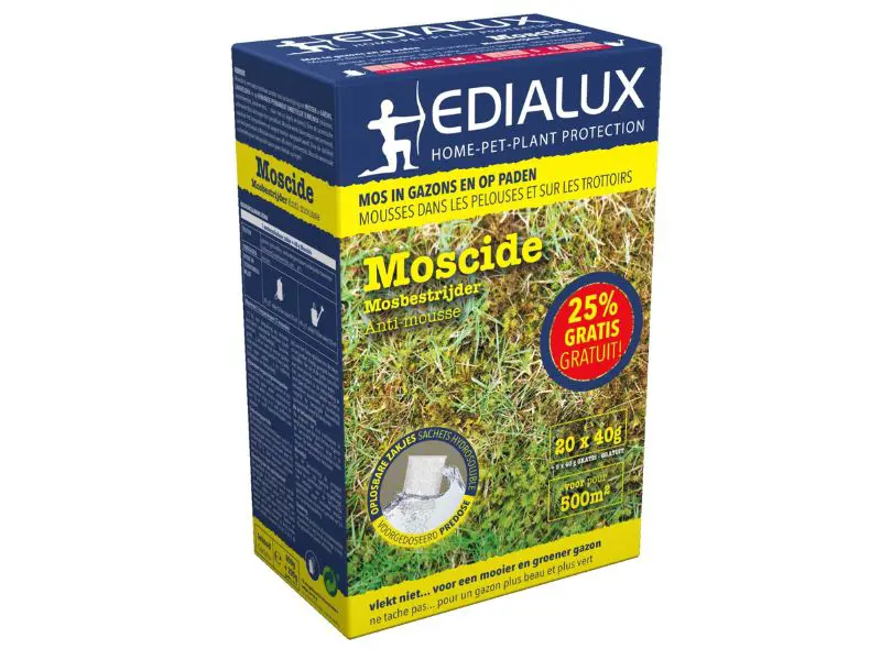 Moscide bestrijdt mos in gazons en op verharde permanent onbeteelde terreinen (dolomiet, kiezelsteentjes,...). Het middel veroorzaakt na betreding geen vlekken op de tegels van jouw terras. Het is zeer eenvoudig in gebruik: 5 voorgedoseerde wateroplosbare zakjes van 40 gram.