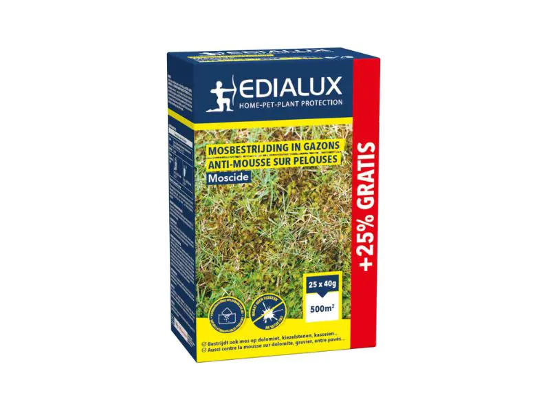Dit mosbestrijdingsproduct werkt niet verzurend, waardoor het mosprobleem ook op langere termijn aangepakt wordt. Moscide is tevens een efficiënte ijzermeststof waarbij het gras mooi donkergroen kleurt.