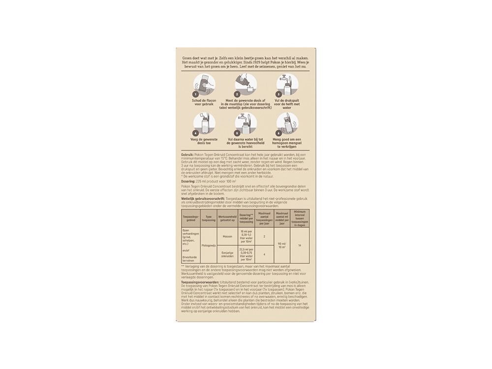 - Bevochtig enkel de onkruiden en voorkom dat het middel van de planten afdruipt.