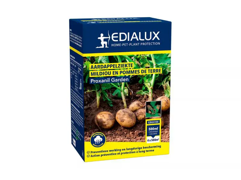 Proxanil Garden is een effectief middel tegen aardappelziekte met twee actieve stoffen, voor zowel preventieve als curatieve bescherming. Dankzij de translaminaire werking verspreidt het product zich door het blad en werkt het op meerdere fronten: het remt de schimmel in de plant en blokkeert de ontwikkeling van sporen en sporendragers. Bovendien is Proxanil Garden regenvast, waardoor de werking ook bij neerslag behouden blijft.