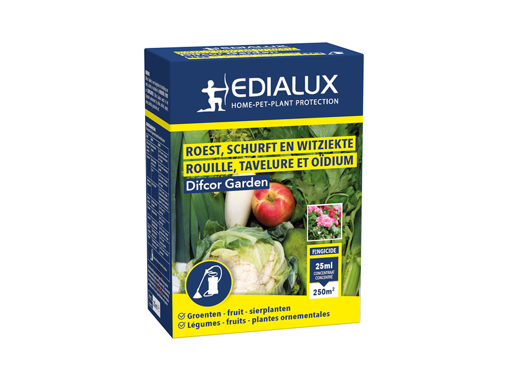 Difcor Garden van Edialux is een fungicide ter bestrijding van roest, schurft en witziekte bij groente, fruit en sierplanten. Difcor is een systemisch fungicide met een preventieve en helende werking. Dit middel wordt in het bijzonder aanbevolen bij selder, witloof, appels, peren, surfina's, geraniums,etc.
