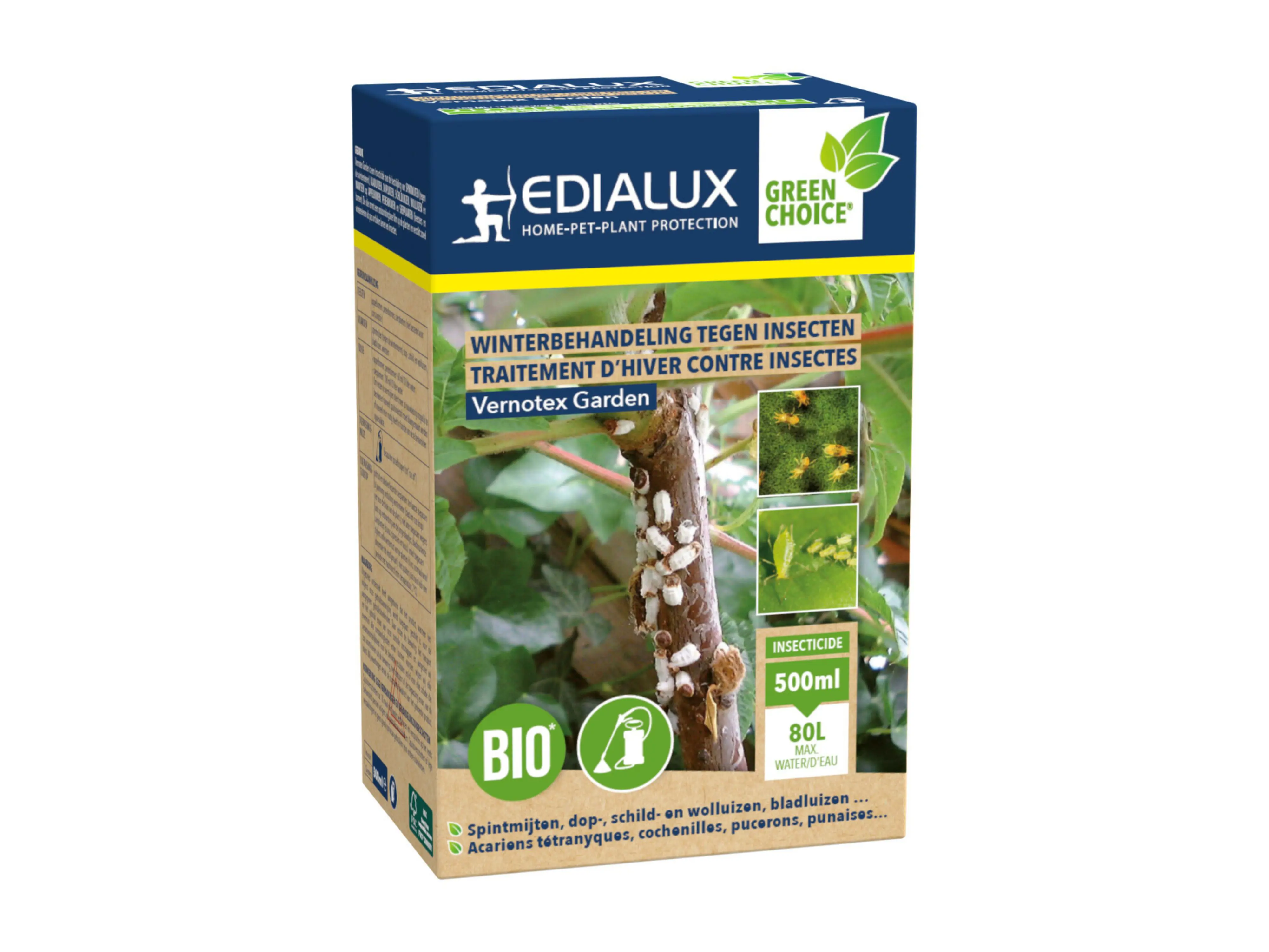 Een winterbehandeling van bladloze fruitbomen met dit product is ideaal om aanwezige pakketjes eieren van wintervlinders te bestrijden. Het product elimineert trouwens ook andere mogelijke dierlijke belagers van de boom of struik zoals overwinterende vormen van spintmijten, bladluizen,... Minerale oliën (o.a. paraffine-oliën zijn toegelaten als insecticide en fungicide in de biologische landbouw.