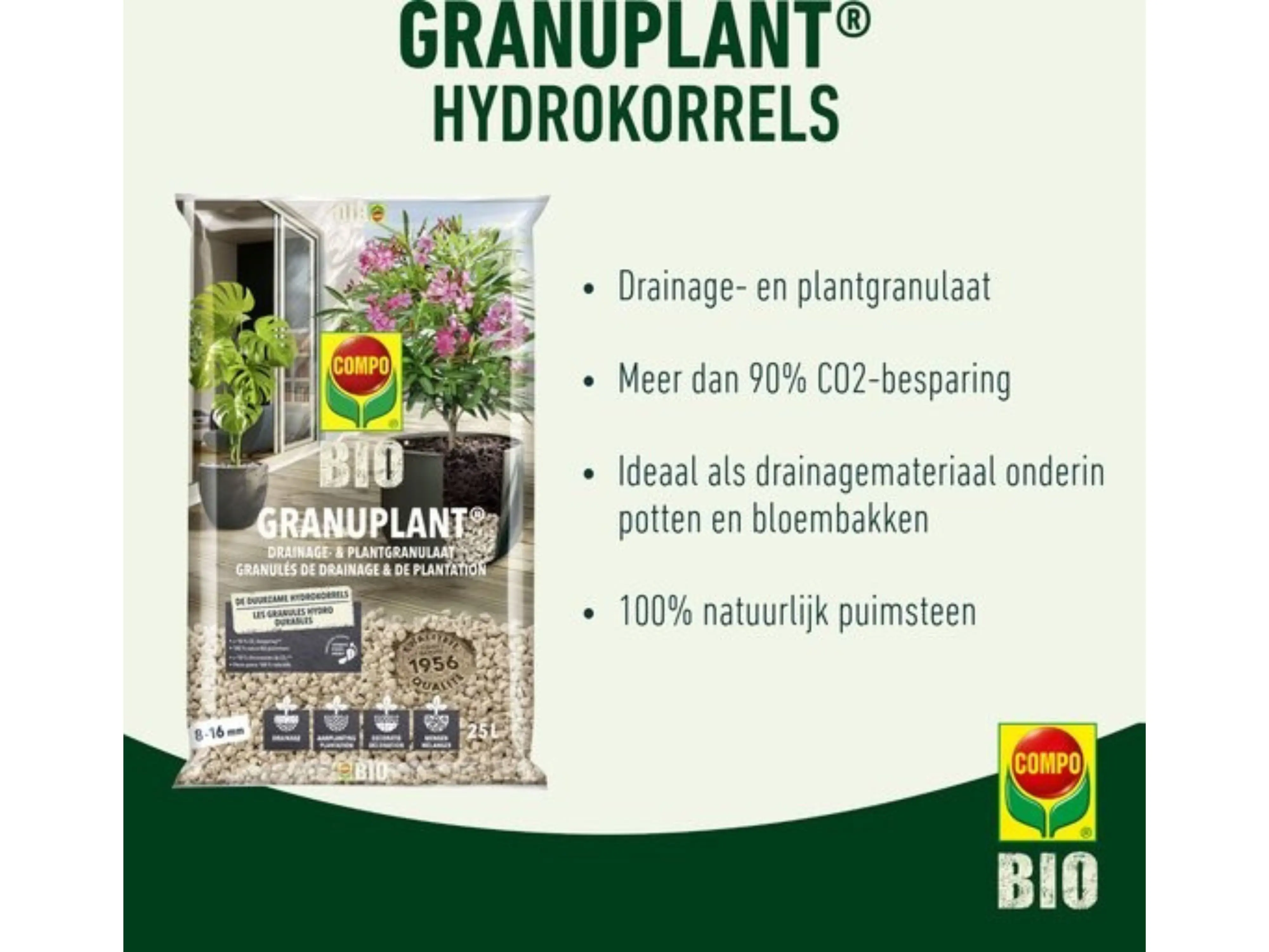 Compo Bio Granuplant is een 100% natuurlijk alternatief voor de traditionele hydrokorrels. Want het productieproces van deze traditionele kleikorrels is extreem CO2-intensief. De puimsteenkorrels van Compo daarentegen zijn duurzaam met 96% minder CO2-uitstoot!