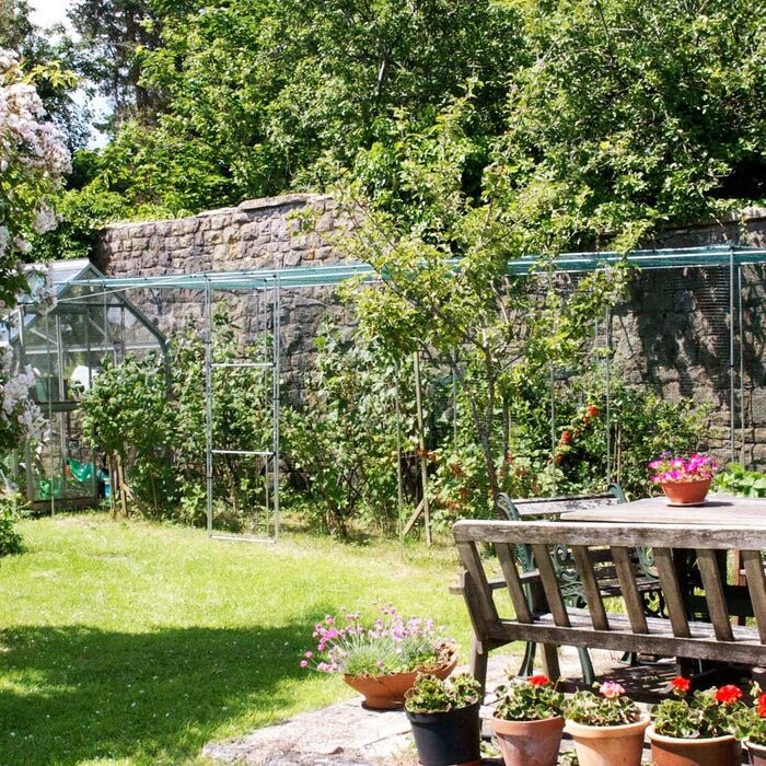 Deze bouwset bestaat uit een aluminium buizensysteem dat in elkaar wordt gezet met UV-gestabiliseerde PVC verbindstukken. Dit pakket bevat ook geëxtrudeerde kunststofnetten, netklemmen en grondpinnen. Om het geheel af te werken bevat dit pakket ook een deurframe met scharnieren zodat je de kooi altijd vlot kan betreden.
