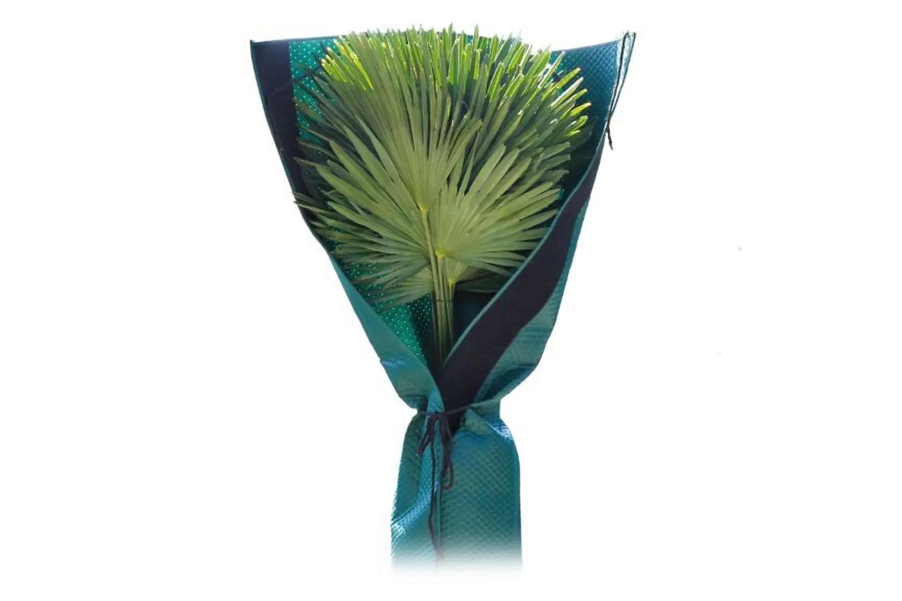 Scherm jouw palmboom af tegen vorst, koude wind en sneeuw met deze beschermhoes. De groene ademende hoes dekt zowel de stam als de bladeren af van de palmboom. Dankzij de praktische veters kan je de de hoes eenvoudig en stevig rond de boom vastbinden.