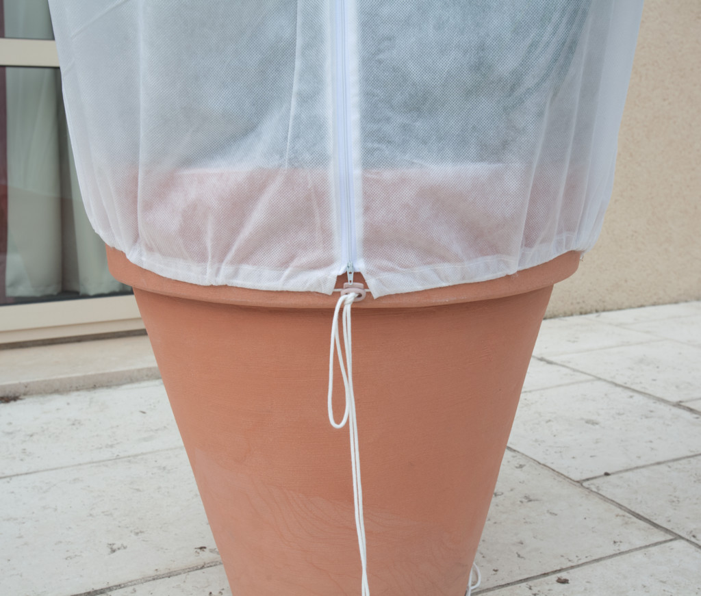 Twee vorsthoezen van Nortene voorzien van een ritssluiting en een trekkoord om makkelijk rond potplanten te kunnen aanbrengen. Vliesdoek is steeds lucht-, licht- en waterdoorlatend zodat de planten geen hinder ondervinden van de afscherming. Binnenin wordt de warmte vast gehouden waardoor een microklimaat ontstaat. Op die manier zijn de planten beschermd tegen vorst, sneeuw en koude wind.