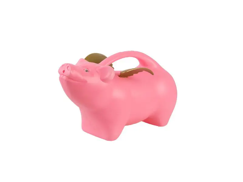 Trendy roze ‘Vliegend varken’ gieter met meedraaiende pupillen en goudkleurige vleugels. “If pigs could fly” is een bekende uitdrukking om in een grappige manier iets te zeggen dat het onmogelijk is. Deze plastic gieter is uitgevoerd in de vorm van een gevleugelde varken. Door de opening in de mond is het doelgerichte water geven aan planten geen probleem.