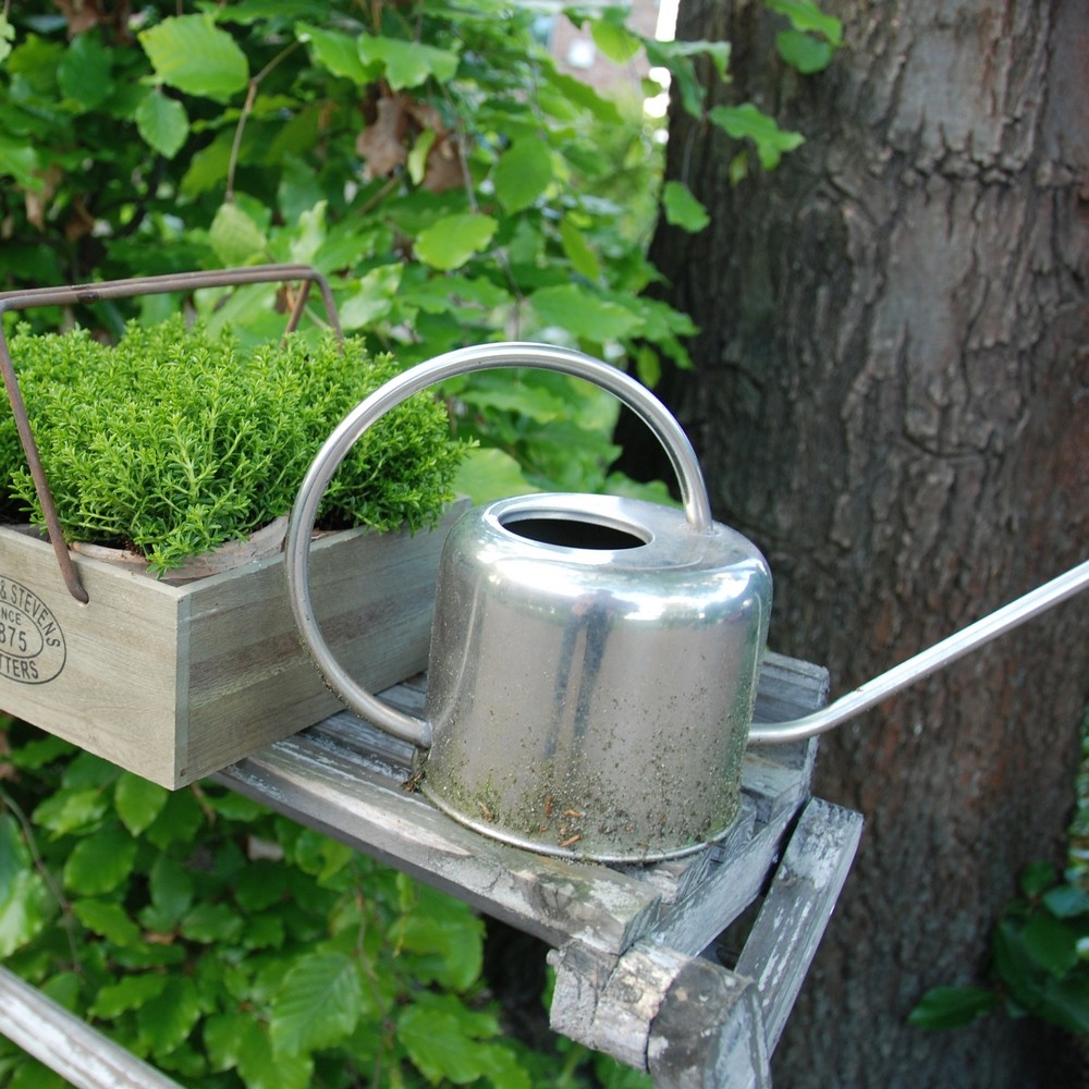 Een eigentijdse roestvrijstalen bloemengieter van Esschert design met een inhoud van 1 liter, ideaal voor het verzorgen van je kamerplanten. De gieter heeft een modern design en met de lange smale tuit kan je de planten gericht water geven. Vullen kan makkelijk via de grote opening.