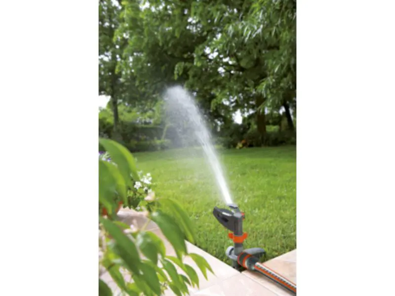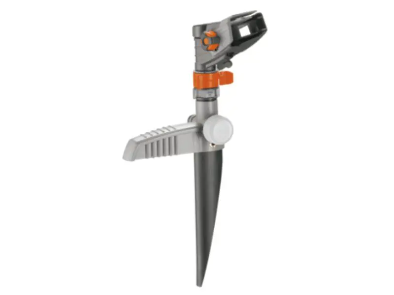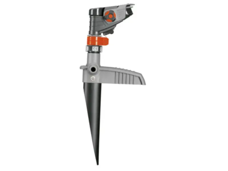 De Gardena Premium Pulserende sector- en cirkelsproeier besproeit zonder moeite grote oppervlakken. De sproeier is gemaakt van een robuuste combinatie van metaal en kunststof. Hierdoor is de sproeier zeer stabiel. Met de stelringen kun je eenvoudig instellen welke sector er moet worden besproeid, met fijne instelmogelijkheden van 25° tot 360°. De geselecteerde sector kan altijd vanaf deze stelringen worden bekeken. De zeer precieze, koperen spuitmond zorgt voor een precieze verdeling van het water. Je kunt het bereik instellen met de grote, eenvoudig te gebruiken draaiknop. Dit kan worden ingesteld van 5 m tot maximaal 12,5 m. Er kan een oppervlak van 75 m² tot maximaal 490 m² worden besproeid. De schroefdraad wordt op de sproeikop geschroefd en heeft een diameter van 21 mm (G 1/2). De sproeier wordt op een metalen spike gemonteerd. Hiermee kan de Gardena Premium Pulserende sector- en cirkelsproeier eenvoudig in het gazon worden geplaatst. En de sproeier kan net zo gemakkelijk weer ergens anders worden neergezet. De sproeier is voorzien van het verbindingsstuk en de einddop van het Gardena System. Je kunt hem meteen gebruiken. Met het Gardena Kraanaansluitstuk (art.nr. 901) kunnen er meerdere sproeiers op elkaar worden aangesloten. Grote oppervlakken kunnen zonder problemen worden besproeid.