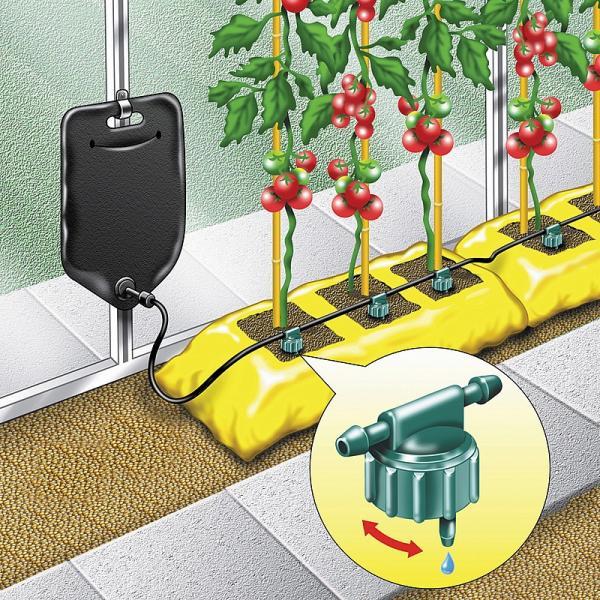 De waterzak van de druppelkit kan 10 liter water bevatten. Je kan de watertoevoer via 6 onafhankelijke druppelaars individueel regelen. De druppelkit hoeft niet te worden aangesloten op een waterleiding en werkt helemaal op zichzelf zonder elektriciteit of andere nutsvoorzieningen. De speciale, stevige waterzak hang je omhoog met de ophanghaak en vul je snel en eenvoudig op via de opening bovenaan.