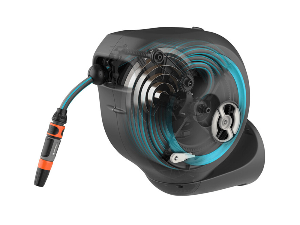 De tuinslang wordt automatisch in heel korte intervallen vergrendeld zodra je stopt, wat betekent dat de slang eenvoudig en makkelijk te hanteren is. Door lichtjes aan het uiteinde van de slang te trekken, wordt het systeem ontgrendeld. Een ingebouwde stalen veer met RollControl-technologie zorgt voor soepel en gecontroleerd oprollen. De RollControl beschermt de slangenbox en de omgeving tegen schade als gevolg van het te snel inrollen. Om knikken of knopen in de slang te voorkomen, heeft de box een geïntegreerde slanggeleider.