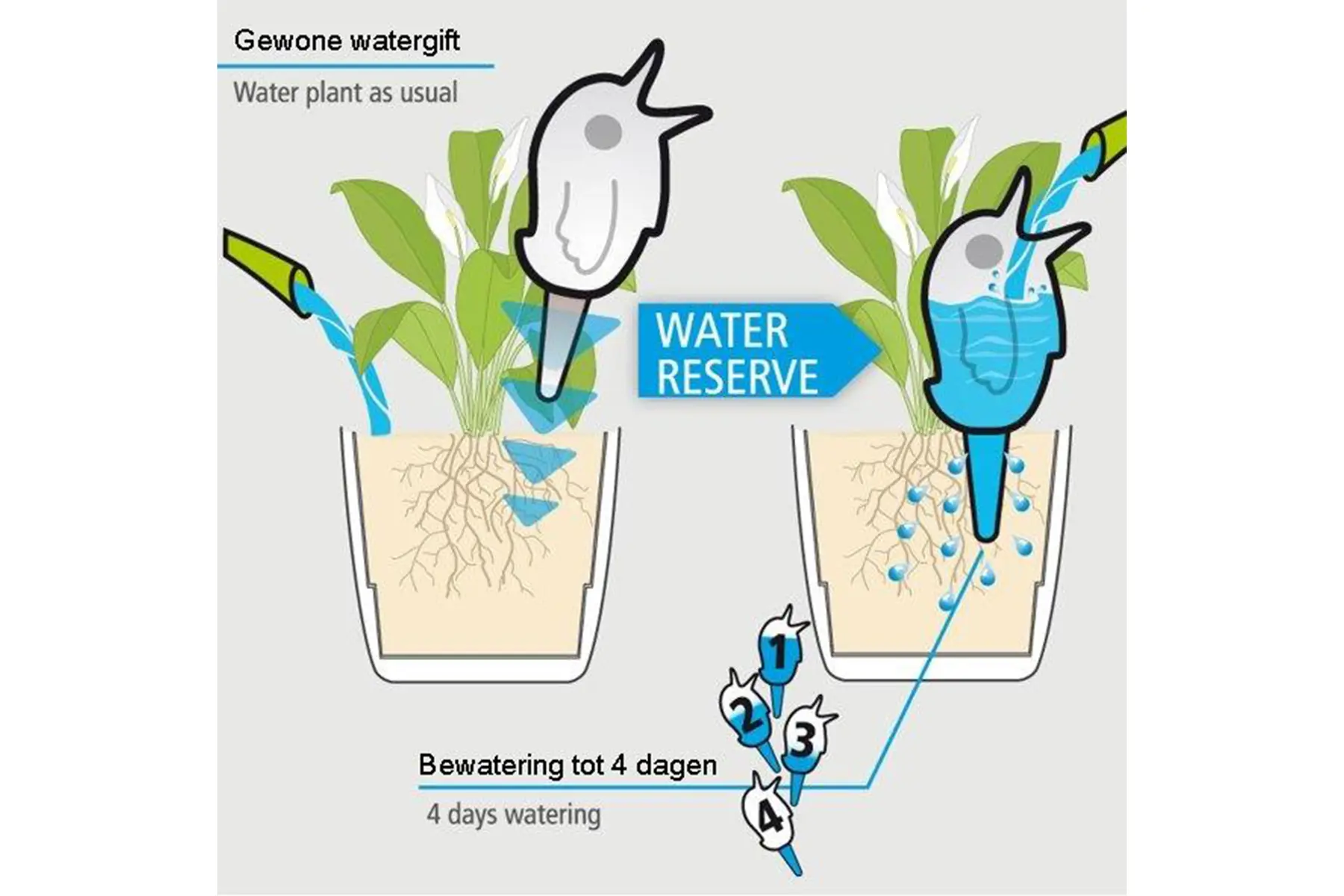 Prik de terracotta prikker in de potgrond van jouw kamer- of potplant en vul het kunststof waterreservoir met water via het vogelbekje. Het water wordt langzaam aan de potgrond vrijgegeven en voorziet op die manier jouw planten tot 4 dagen van water. Het vogeltje is transparant waardoor je makkelijk ziet wanneer je water bij kan geven.
