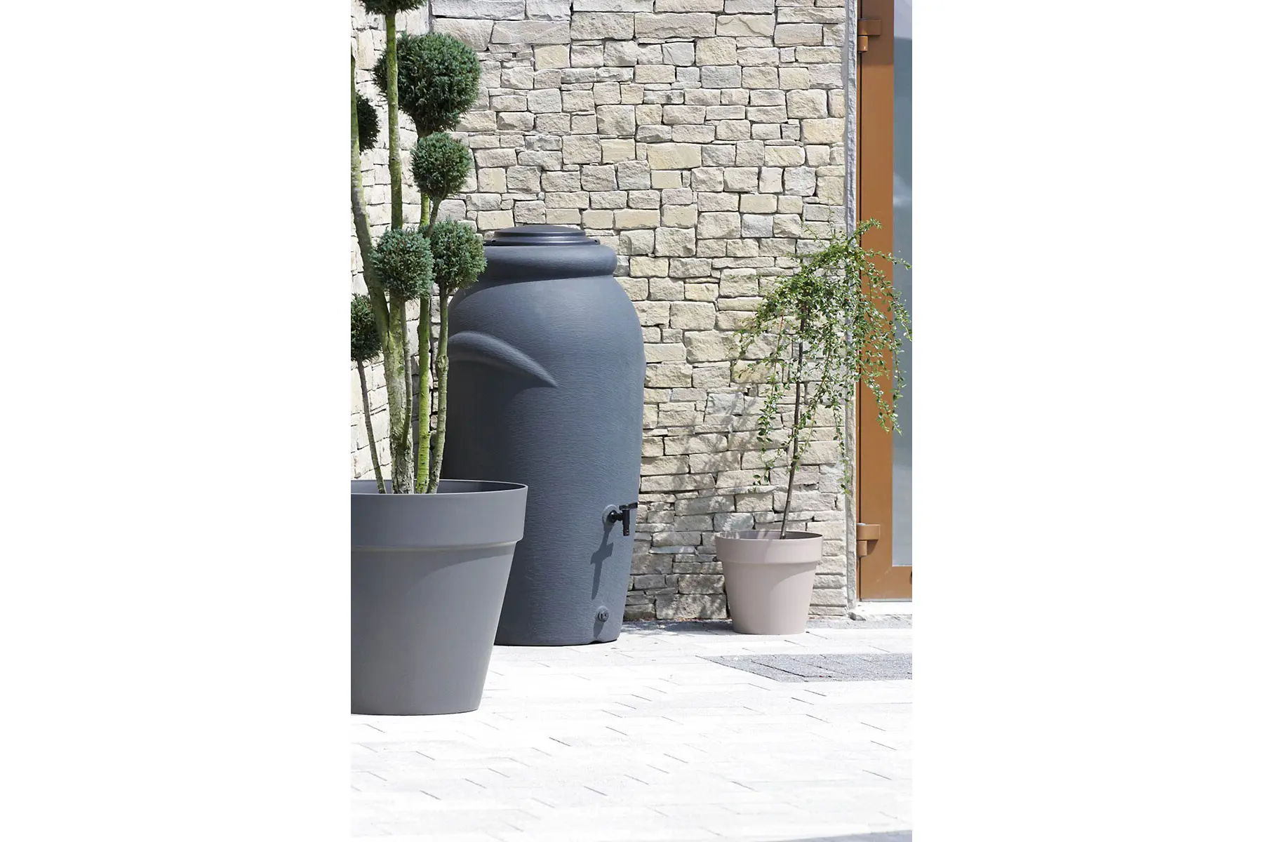 Mooie decoratieve kunststof regenton voor de opvang van regenwater. Deze ton heeft bovenin een opening met een deksel van Ø 26 cm. Ze is gemaakt uit duurzame kunststof en ziet er uit als een grote stenen urne. Dit kleinere model is uitermate geschikt voor de kleine ruimte en kan toch nog water opvangen tot 210 liter.
