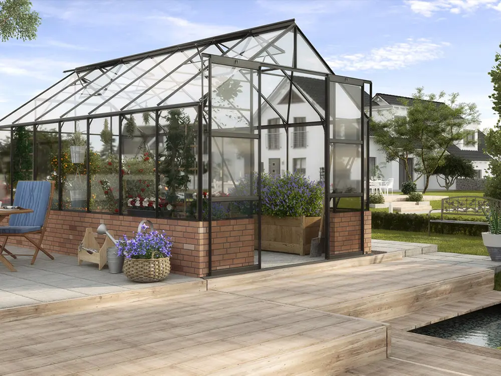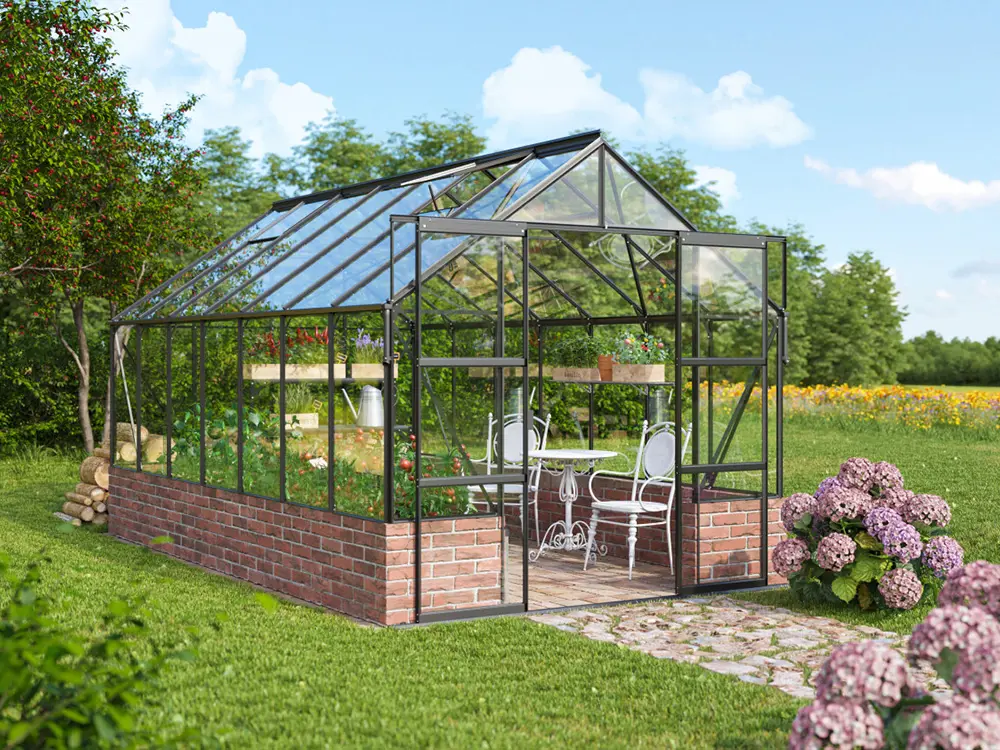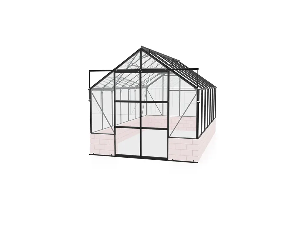 Mercurius is een fraai ogende tuinkas speciaal ontworpen voor de veeleisende tuinier die zowel kwaliteit als esthetiek belangrijk vindt. De kas dient op een stenen of houten wand/muur met een hoogte van 50 cm gemonteerd te worden. Deze onderbouw verhoogt de isolatie en dus ook het rendement van jouw kas. Het zorgt bovendien voor een persoonlijke touch zodat de kas helemaal naar jouw stijl kan worden opgebouwd. Het frame bestaat uit stevige, zwart gepoedercoate aluminium profielen.