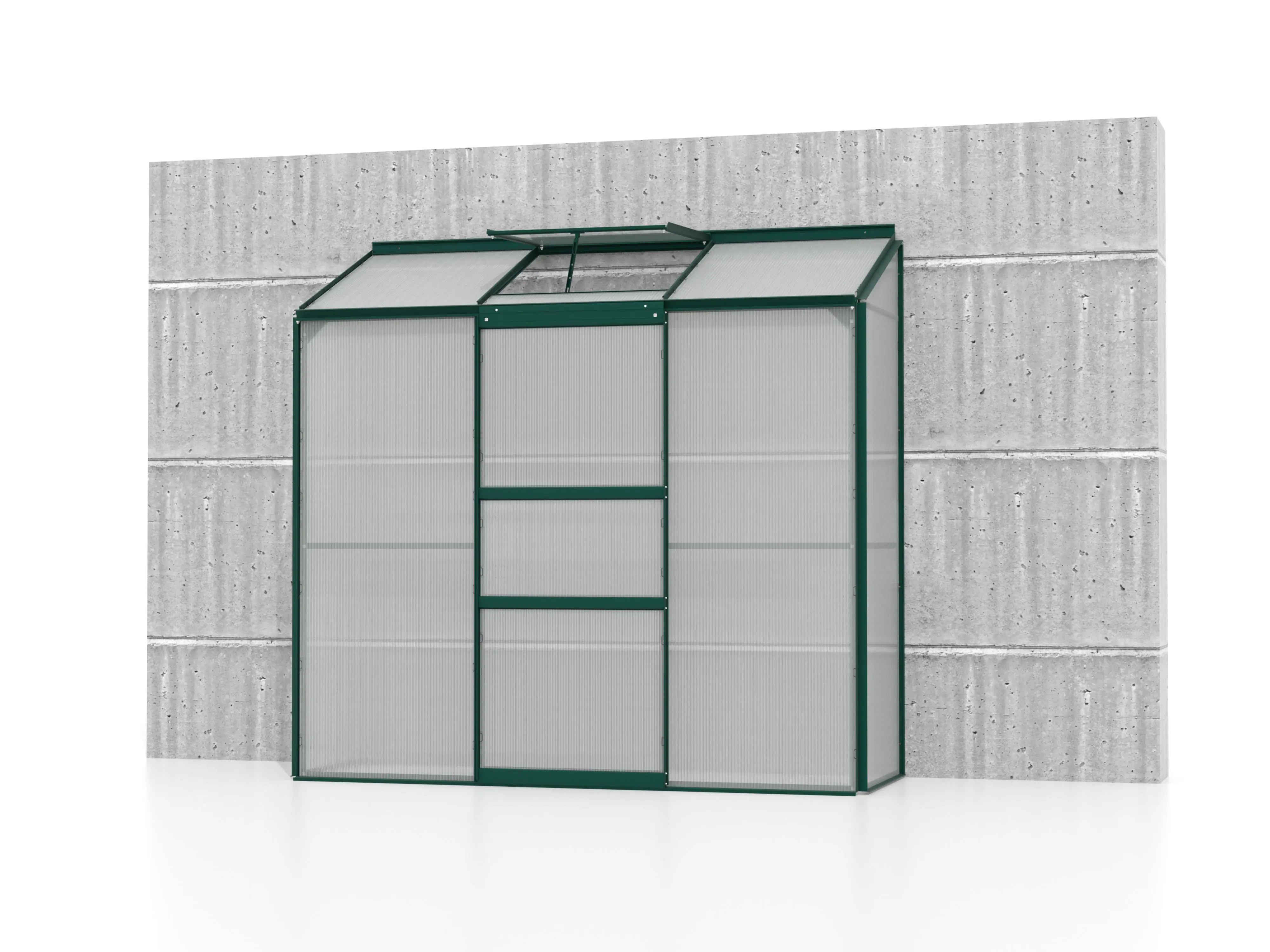 De profielen zijn gemaakt van gepoedercoat groen aluminium, wat ervoor zorgt dat ze er altijd als nieuw uitzien. Als optie kan je kiezen voor een stalen fundering dat de kas met 6 cm verhoogt, waardoor het werken in de kas nog makkelijker wordt. Daarnaast zorgt deze extra fundering voor een vlottere opbouw en een steviger eindresultaat.
