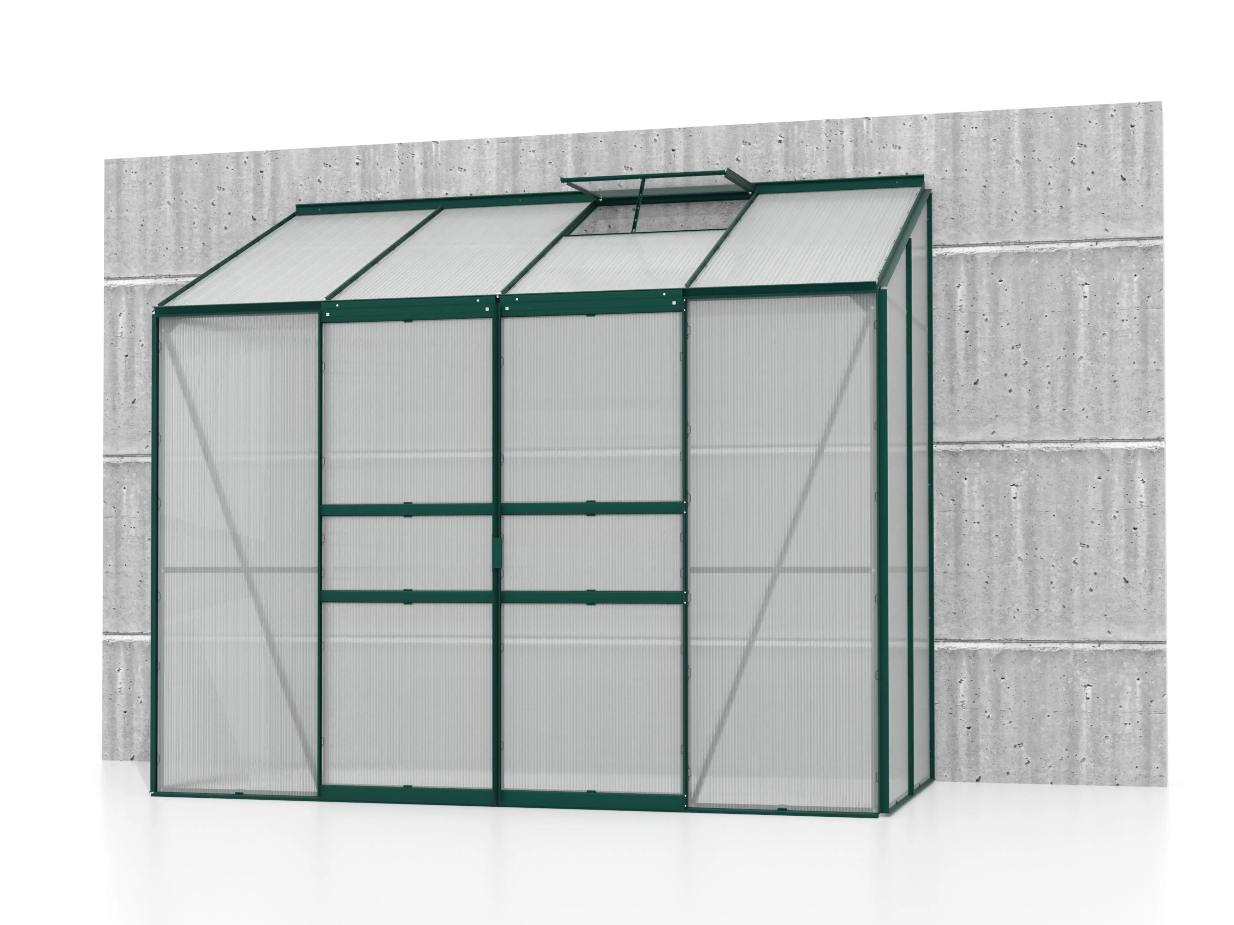 De hoge nok en de soepel schuivende enkele of dubbele deur maken de kas vlot toegankelijk, terwijl één of twee dakramen (afhankelijk van de grootte) zorgen voor een goed geventileerde ruimte. De robuuste profielen van gepoedercoat aluminium blijven jarenlang mooi en onderhoudsvriendelijk.