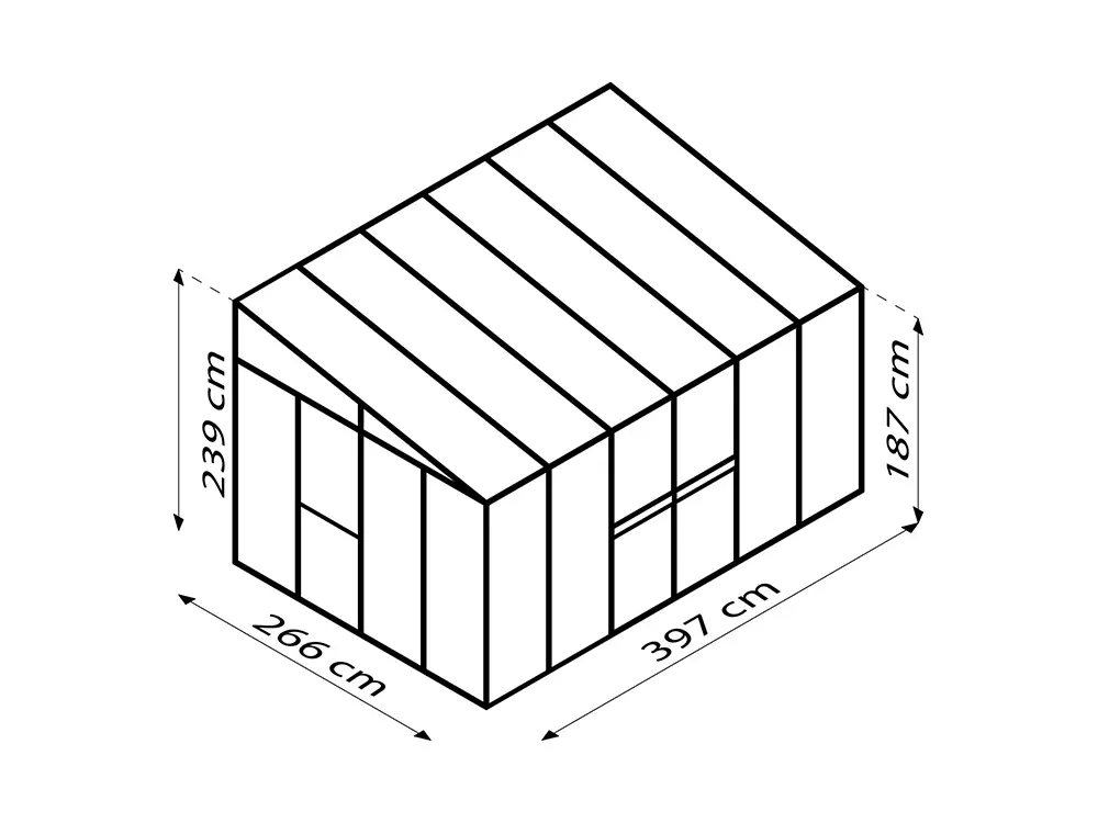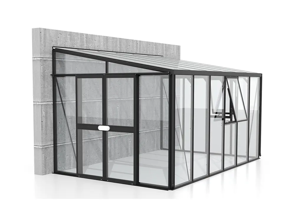 De zijwanden zijn vervaardigd uit 3 mm dik, kristalhelder veiligheidsglas (ESG), terwijl het dak is voorzien van 10 mm dikke dubbelwandige polycarbonaatplaten. Deze beschermen de planten tegen felle zonnestralen, behouden een stabiele temperatuur en zijn bestand tegen vallende takken.