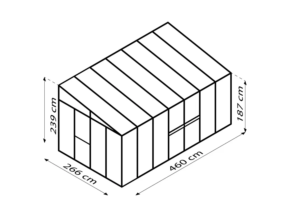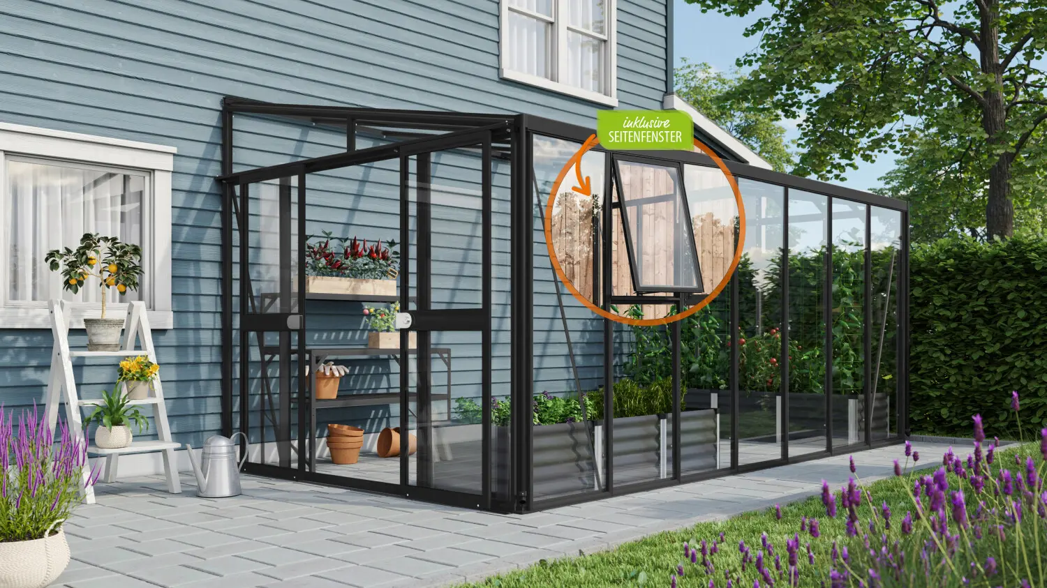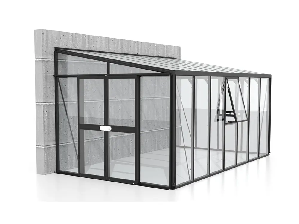 De zijwanden zijn vervaardigd uit 3 mm dik, kristalhelder veiligheidsglas (ESG), terwijl het dak is voorzien van 10 mm dikke dubbelwandige polycarbonaatplaten. Deze beschermen de planten tegen felle zonnestralen, behouden een stabiele temperatuur en zijn bestand tegen vallende takken.