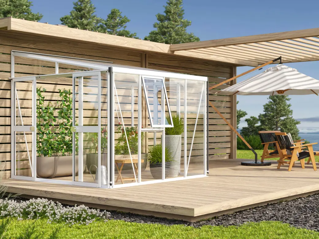 De flexibele dubbele schuifdeur (119 x 177 cm) kan naar wens aan de voor- of zijkant worden geplaatst en is uitgerust met een robuust cilinderslot. De kas wordt standaard geleverd met twee zijramen voor optimale ventilatie, een regenafvoergoot en twee regenpijpen om regenwater efficiënt af te voeren.