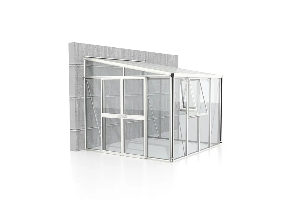 Dankzij de stevige dubbele frameprofielen is de constructie uiterst stabiel en duurzaam. De zijwanden zijn gemaakt van 3 mm dik, kristalhelder veiligheidsglas (ESG), wat zorgt voor een open en ruimtelijk effect. Het dak is voorzien van 10 mm dikke dubbelwandige polycarbonaatplaten, die schadelijke zonnestralen filteren, een constante temperatuur handhaven en bescherming bieden tegen vallende takken.