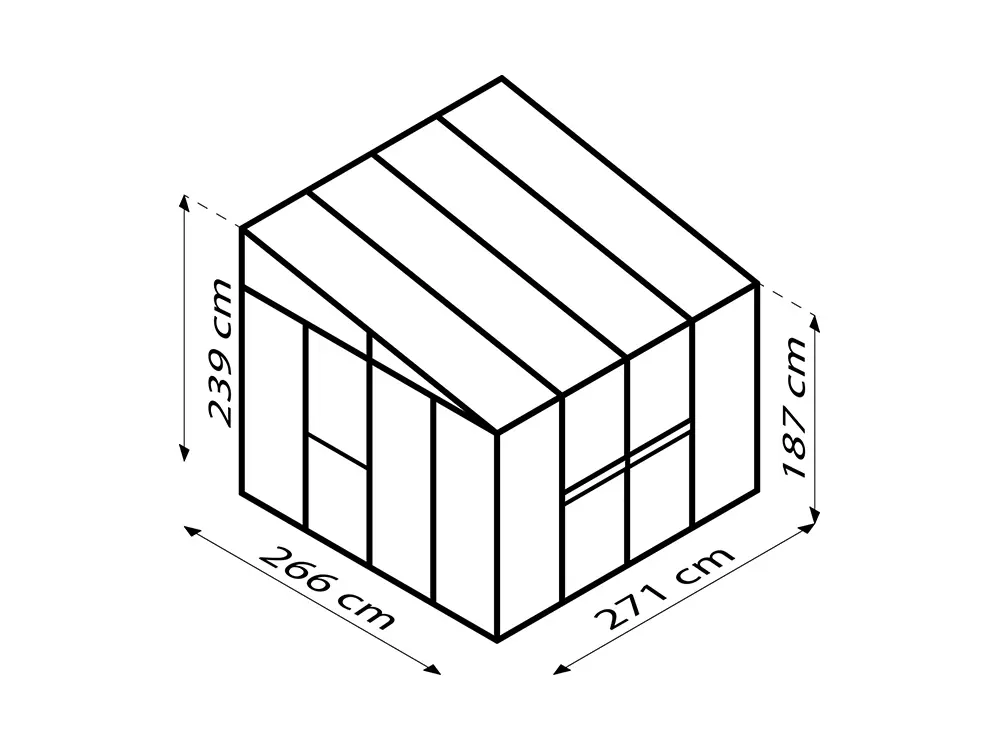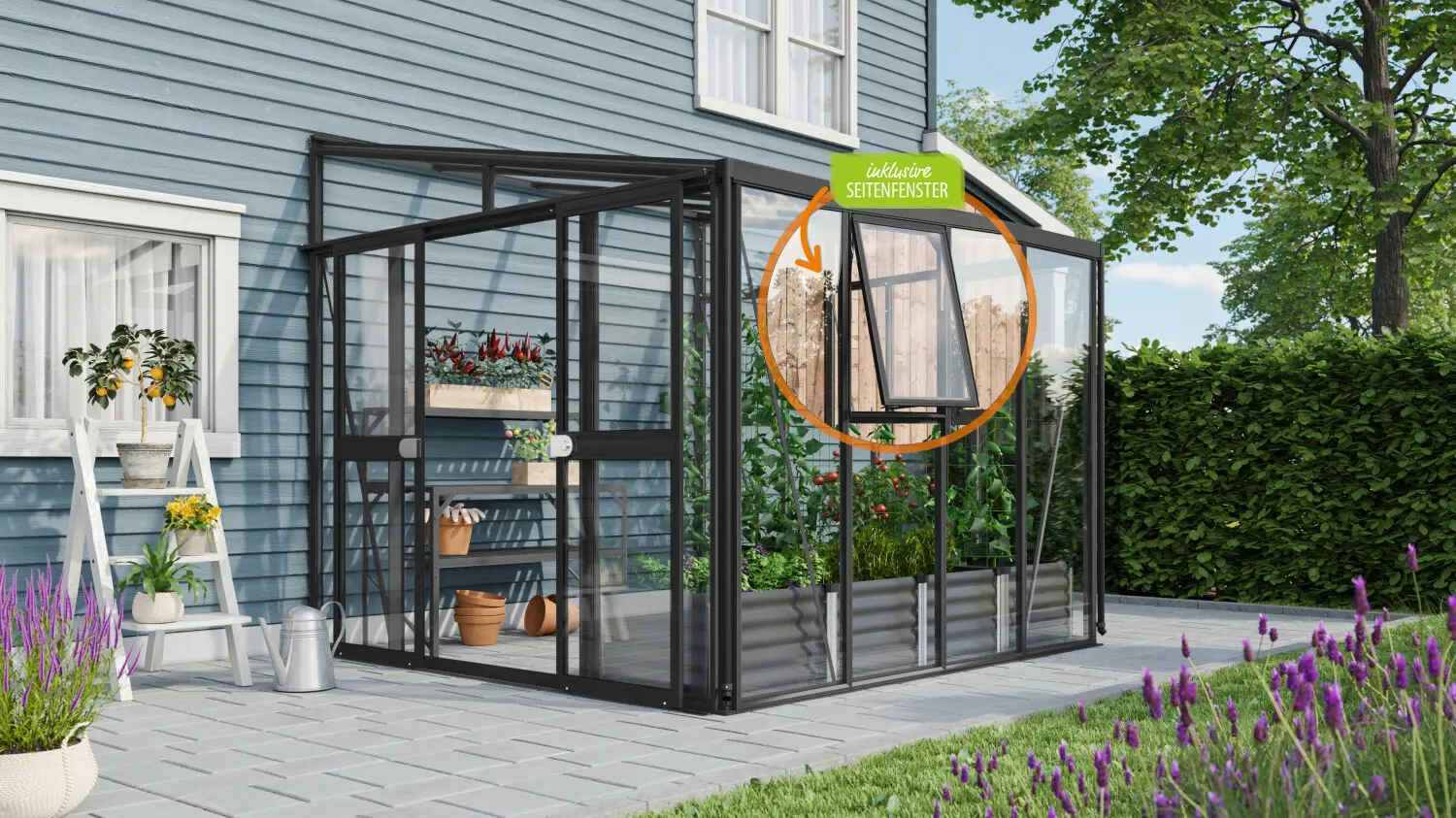 De zijwanden zijn vervaardigd uit 3 mm dik, kristalhelder veiligheidsglas (ESG), terwijl het dak is voorzien van 10 mm dikke dubbelwandige polycarbonaatplaten. Deze beschermen de planten tegen felle zonnestralen, behouden een stabiele temperatuur en zijn bestand tegen vallende takken.