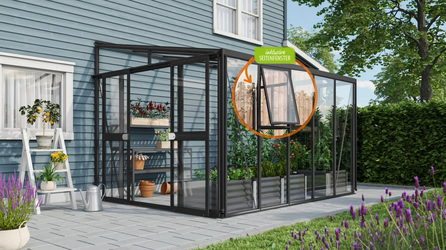 De dubbele schuifdeur (119 x 177 cm) kan flexibel aan de voor- of zijkant worden geplaatst en is uitgerust met een robuust cilinderslot. De standaarduitrusting omvat tevens twee zijramen, een regenafvoergoot en twee regenpijpen.
