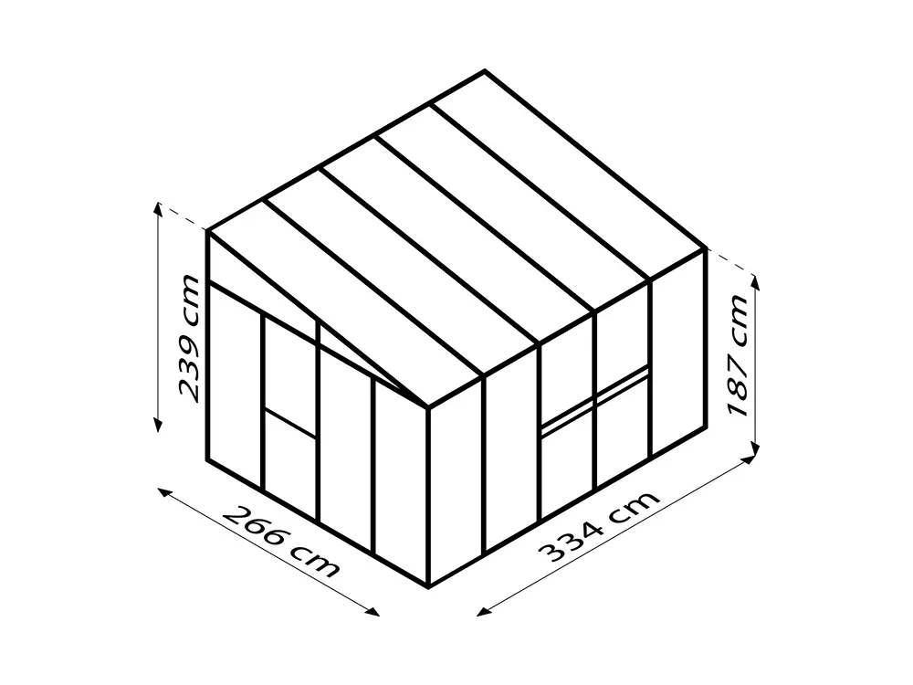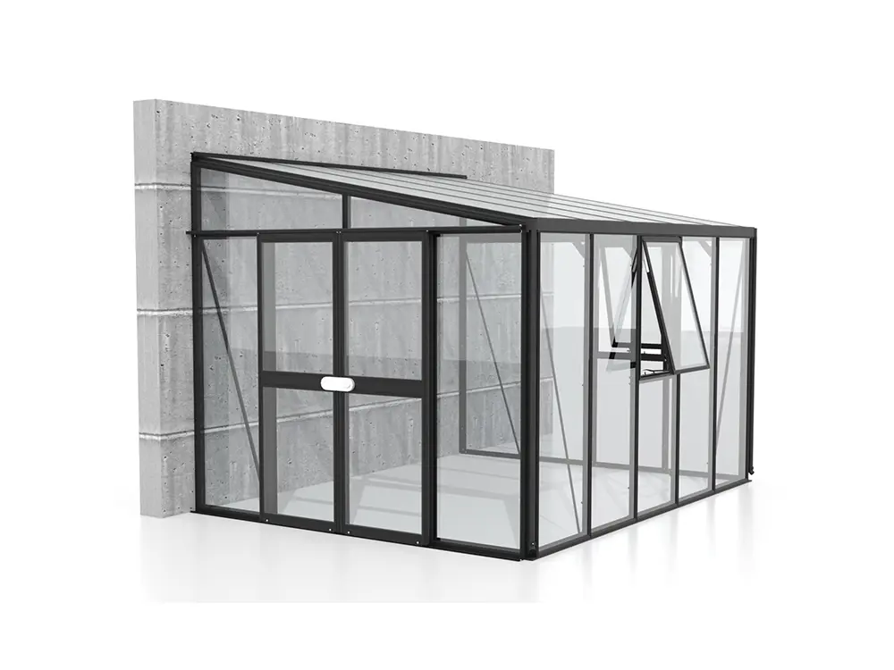 De zijwanden zijn vervaardigd uit 3 mm dik, kristalhelder veiligheidsglas (ESG), terwijl het dak is voorzien van 10 mm dikke dubbelwandige polycarbonaatplaten. Deze beschermen de planten tegen felle zonnestralen, behouden een stabiele temperatuur en zijn bestand tegen vallende takken.