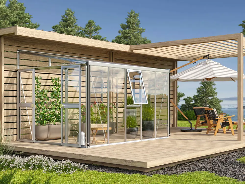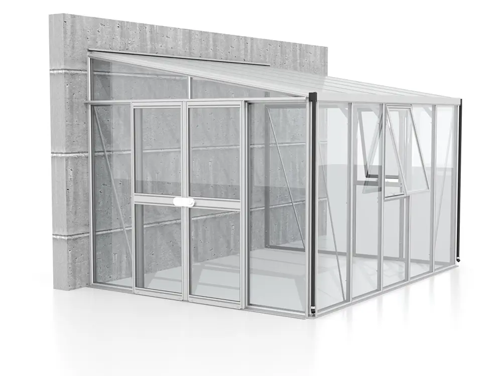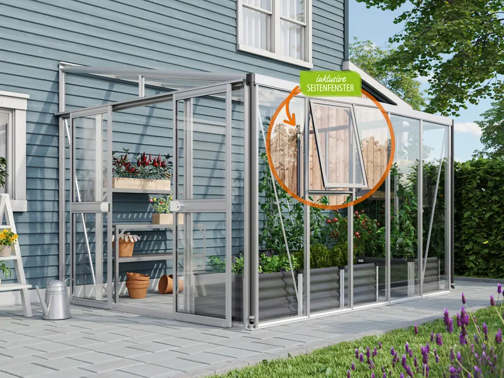De zijwanden zijn voorzien van 3 mm dik, kristalhelder veiligheidsglas (ESG). Het dak is uitgerust met 10 mm dikke dubbelwandige polycarbonaatplaten, die planten beschermen tegen sterke zonnestraling, een stabiele temperatuur behouden en bestand zijn tegen vallende takken.
