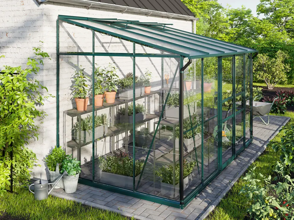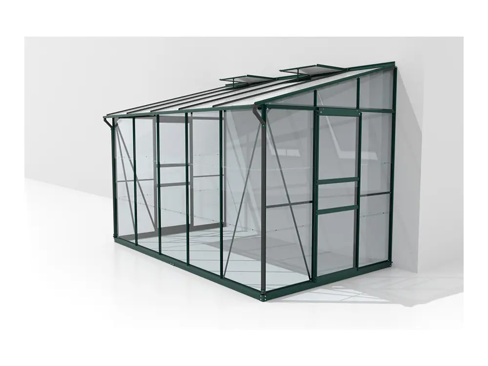 De profielen zijn gemaakt van gepoedercoat groen aluminium, wat ervoor zorgt dat ze er altijd als nieuw uitzien. Het frame is standaard voorzien van 3 mm veiligheidsglas. Als optie kan je kiezen voor een stalen fundering dat de kas met 6 cm verhoogt, waardoor het werken in de kas nog makkelijker wordt. Daarnaast zorgt deze extra fundering voor een vlottere opbouw en een steviger eindresultaat.