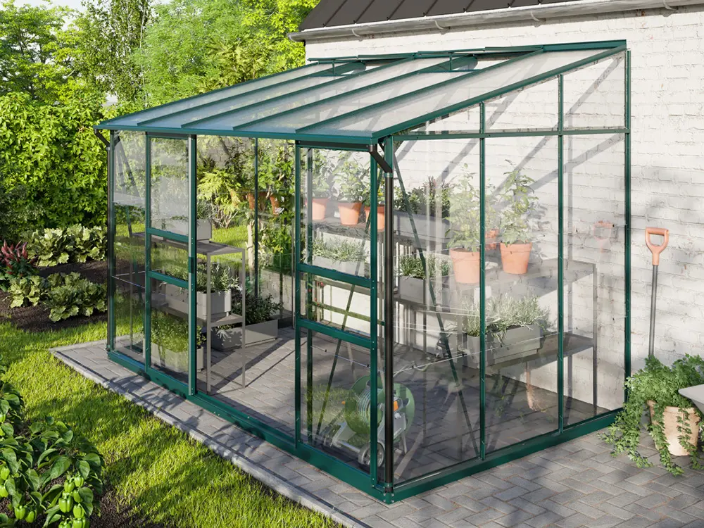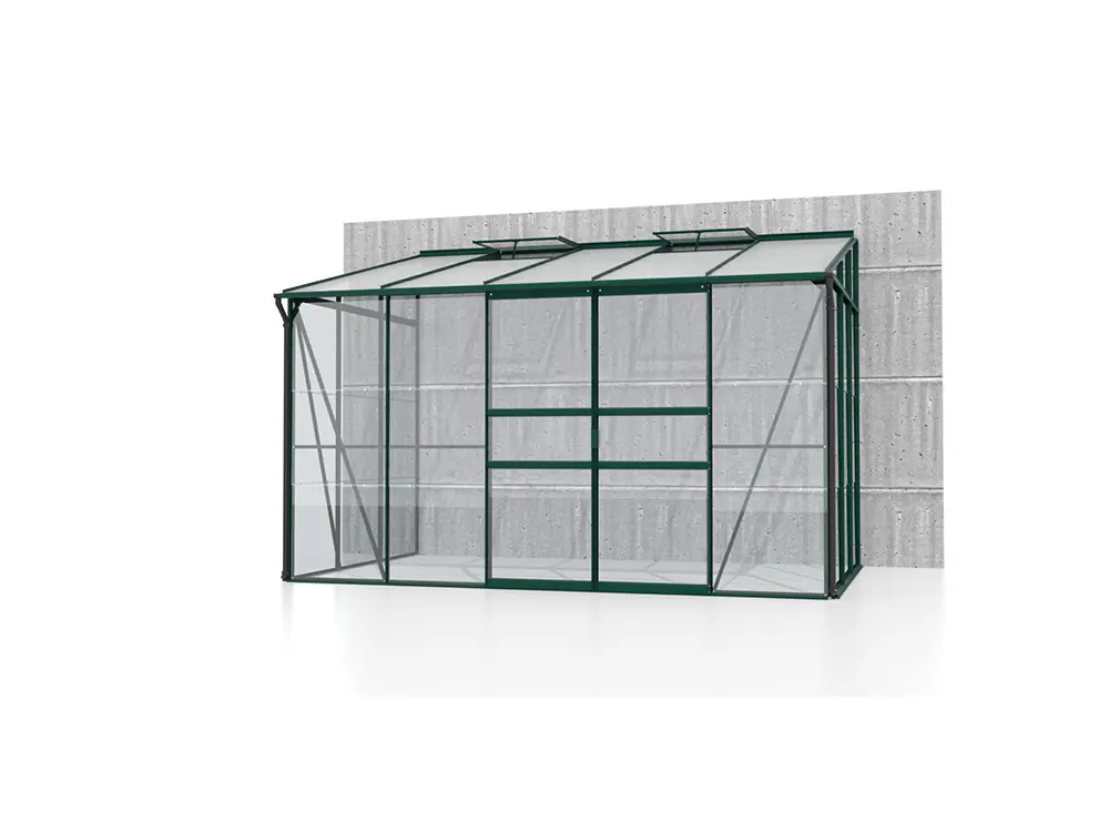 Ida 6500 is voorzien van een dubbele schuifdeur en 2 dakramen. Het dak is uitgerust met 6 mm dikke, UV-gestabiliseerde dubbelwandige polycarbonaatplaten.