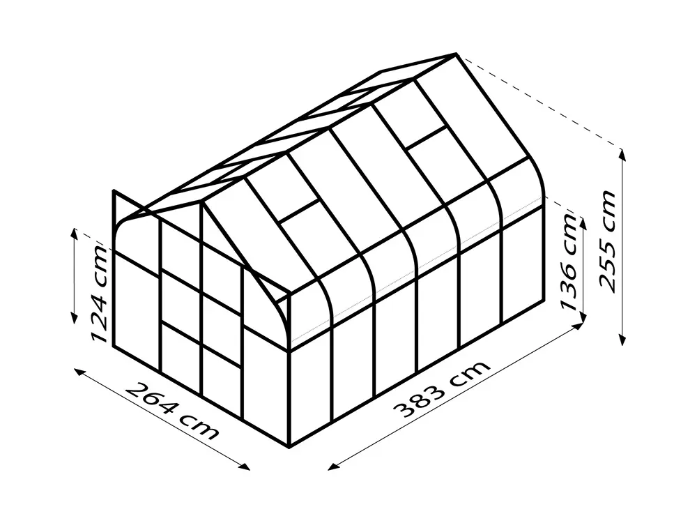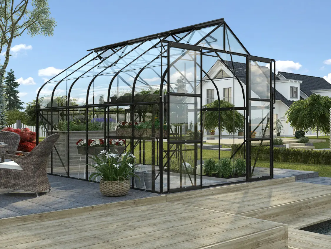 De kas is vervaardigd uit robuust, zwart gepoedercoat aluminium en standaard voorzien van 3 mm veiligheidsglas, wat zorgt voor een stevige constructie en maximale lichtinval. De gebogen randen zijn afgewerkt met UV-bestendige, heldere polycarbonaatplaten. Praktische extra's zijn geïntegreerde goten en 2 tot 4 dakramen (afhankelijk van de grootte). Deze zorgen voor een uitstekende ventilatie en een optimaal groeiklimaat.