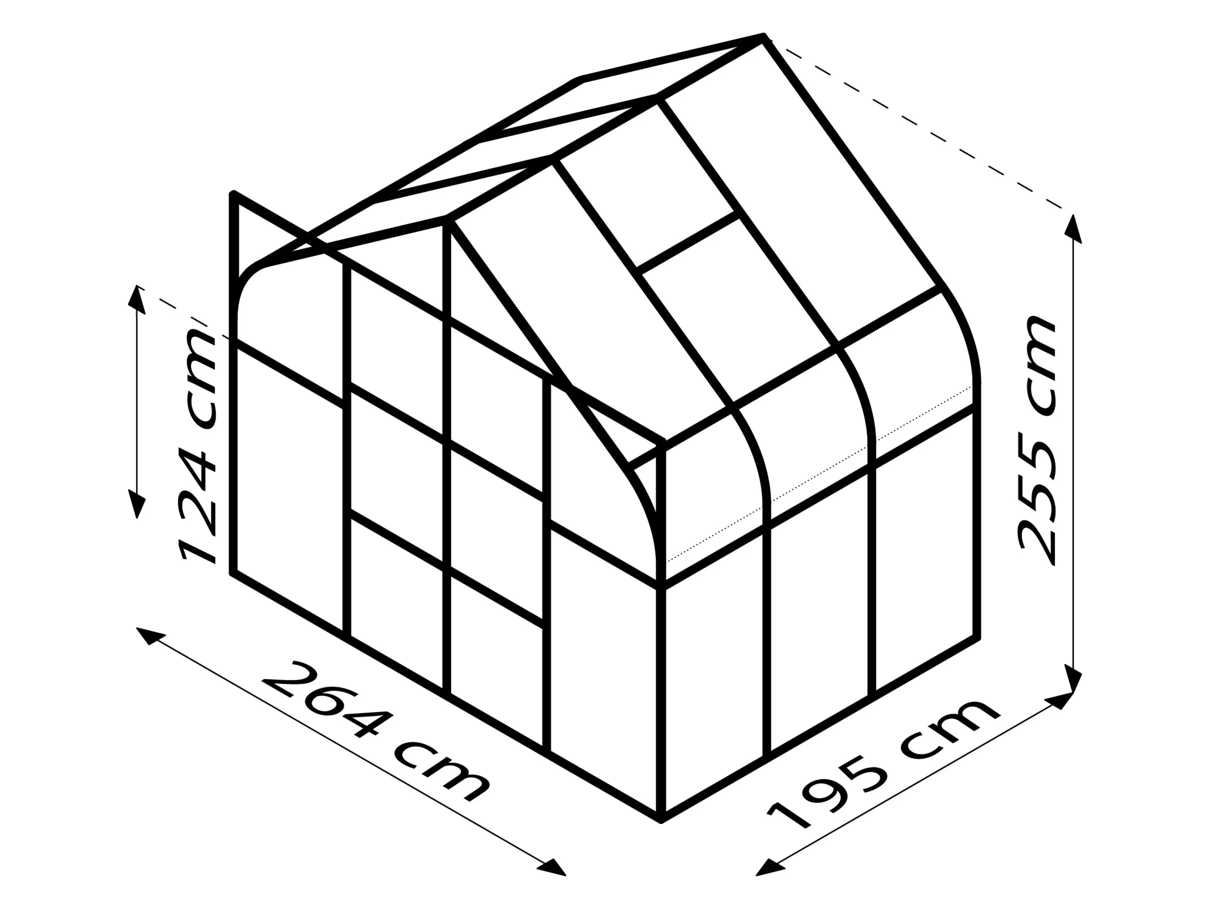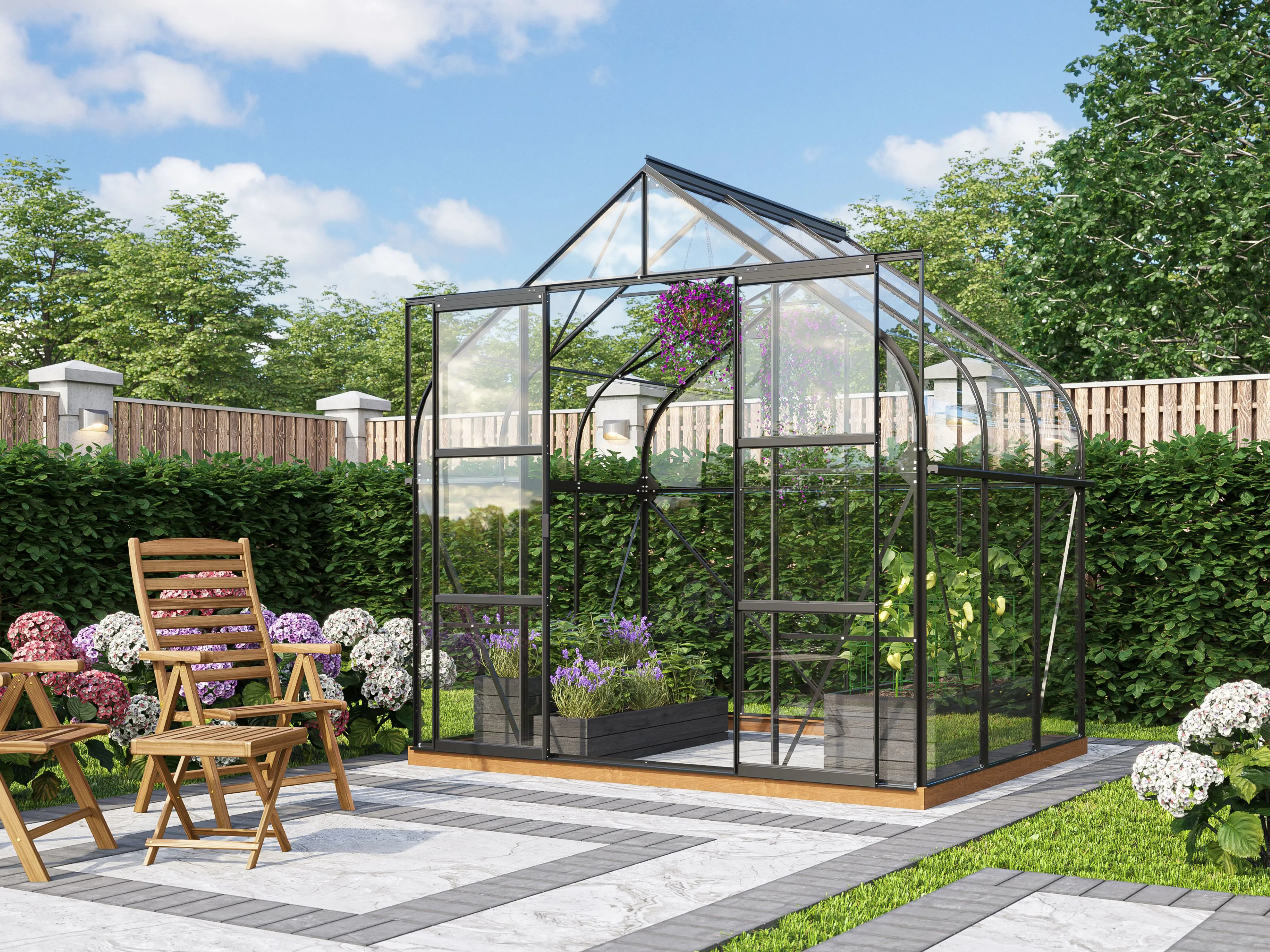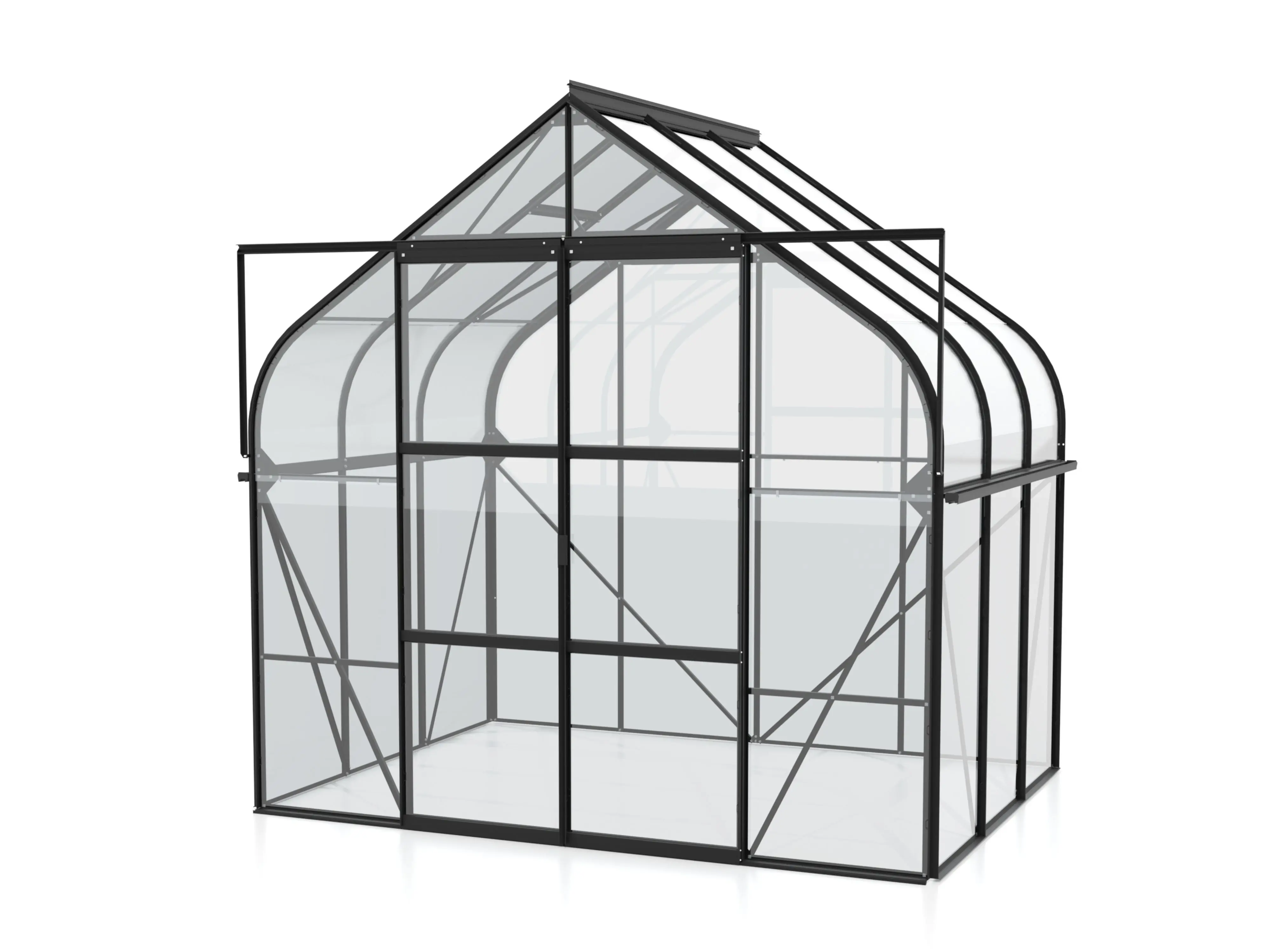 De kas is vervaardigd uit robuust, zwart gepoedercoat aluminium en standaard voorzien van 3 mm veiligheidsglas, wat zorgt voor een stevige constructie en maximale lichtinval. De gebogen randen zijn afgewerkt met UV-bestendige, heldere polycarbonaatplaten. Praktische extra's zijn geïntegreerde goten en 2 tot 4 dakramen (afhankelijk van de grootte). Deze zorgen voor een uitstekende ventilatie en een optimaal groeiklimaat.