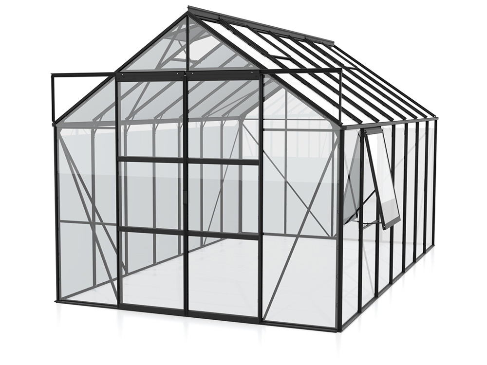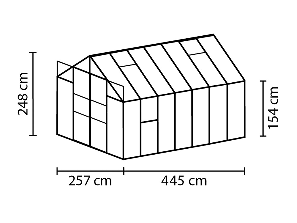 Met een royale hoogte van 248 cm en een breedte van 257 cm biedt de Jupiter meer dan genoeg ruimte. De dakrandhoogte van 154 cm zorgt voor extra stahoogte en werkgemak. Extra stevigheid wordt bereikt door hoekplaten en verstevigingen in de volledige kas, waardoor je ze zonder zorgen zwaarder kunt belasten.