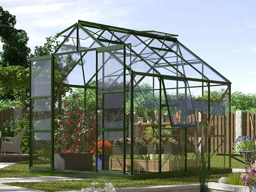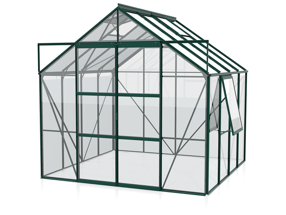 Creëer de ideale omgeving om te kweken, te zaaien en te oogsten met de ruime tuinkas Jupiter van Vitavia. Het is een topmodel uitgerust met een dubbele schuifdeur, 2 tot 4 dakramen afhankelijk van de grootte, en een extra zijvenster, elk voorzien van uitzetters om voor voldoende ventilatie te zorgen.