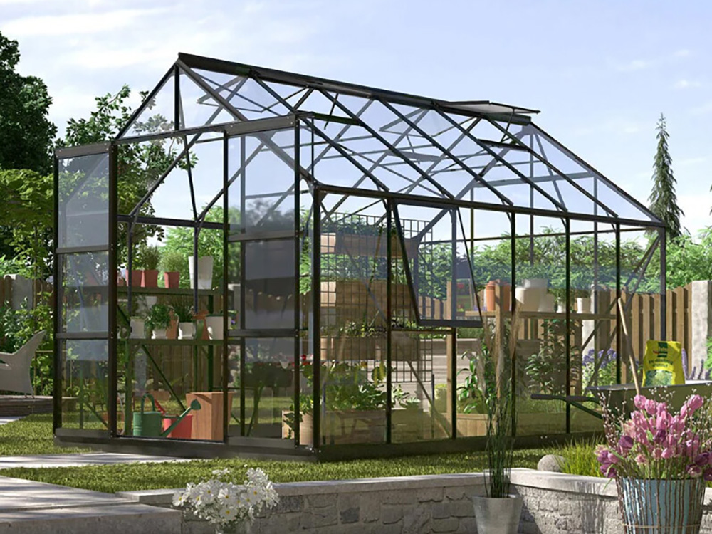 Creëer de ideale omgeving om te kweken, te zaaien en te oogsten met de ruime tuinkas Jupiter van Vitavia. Het is een topmodel uitgerust met een dubbele schuifdeur, 2 tot 4 dakramen afhankelijk van de grootte, en een extra zijvenster, elk voorzien van uitzetters om voor voldoende ventilatie te zorgen.
