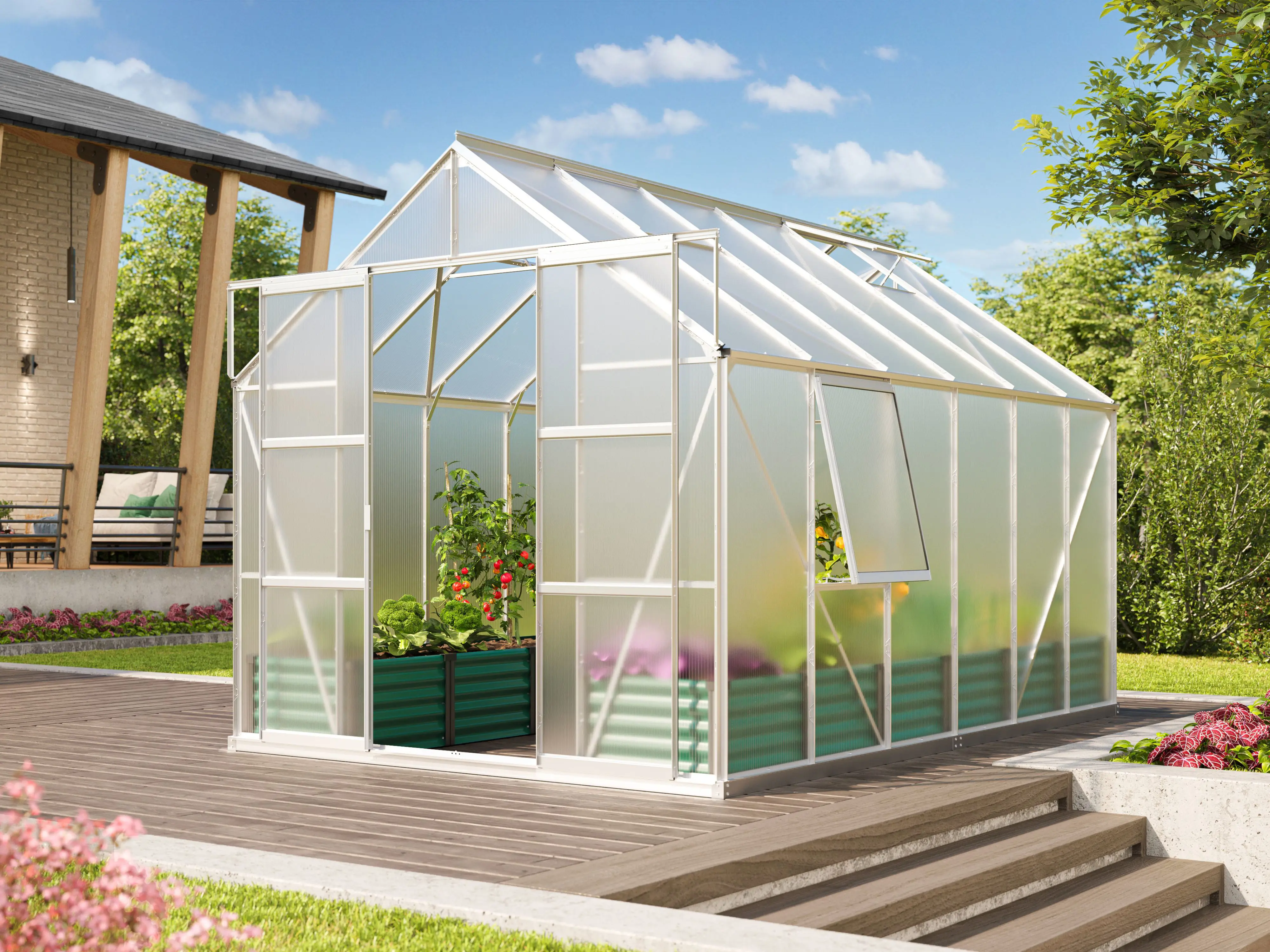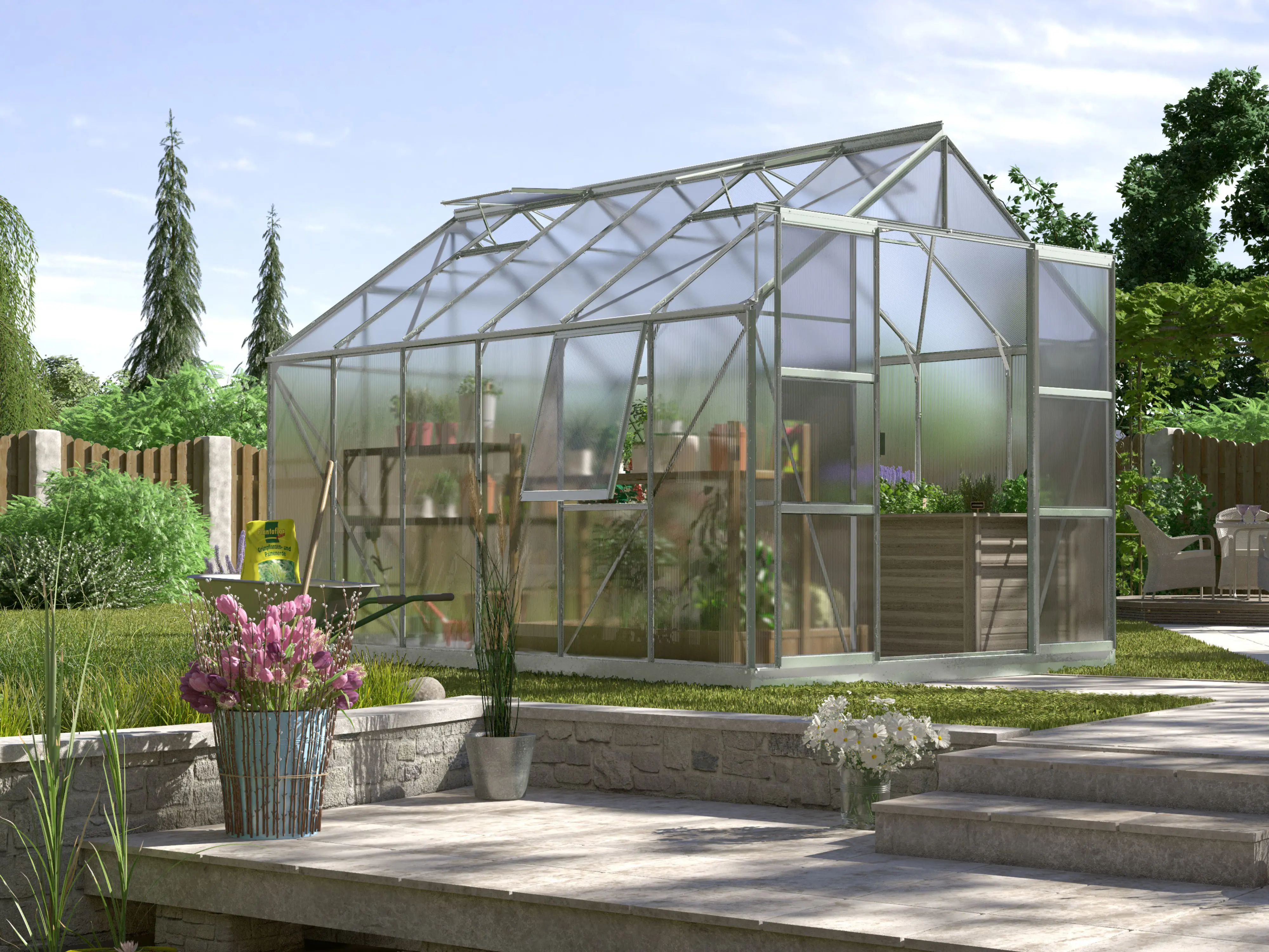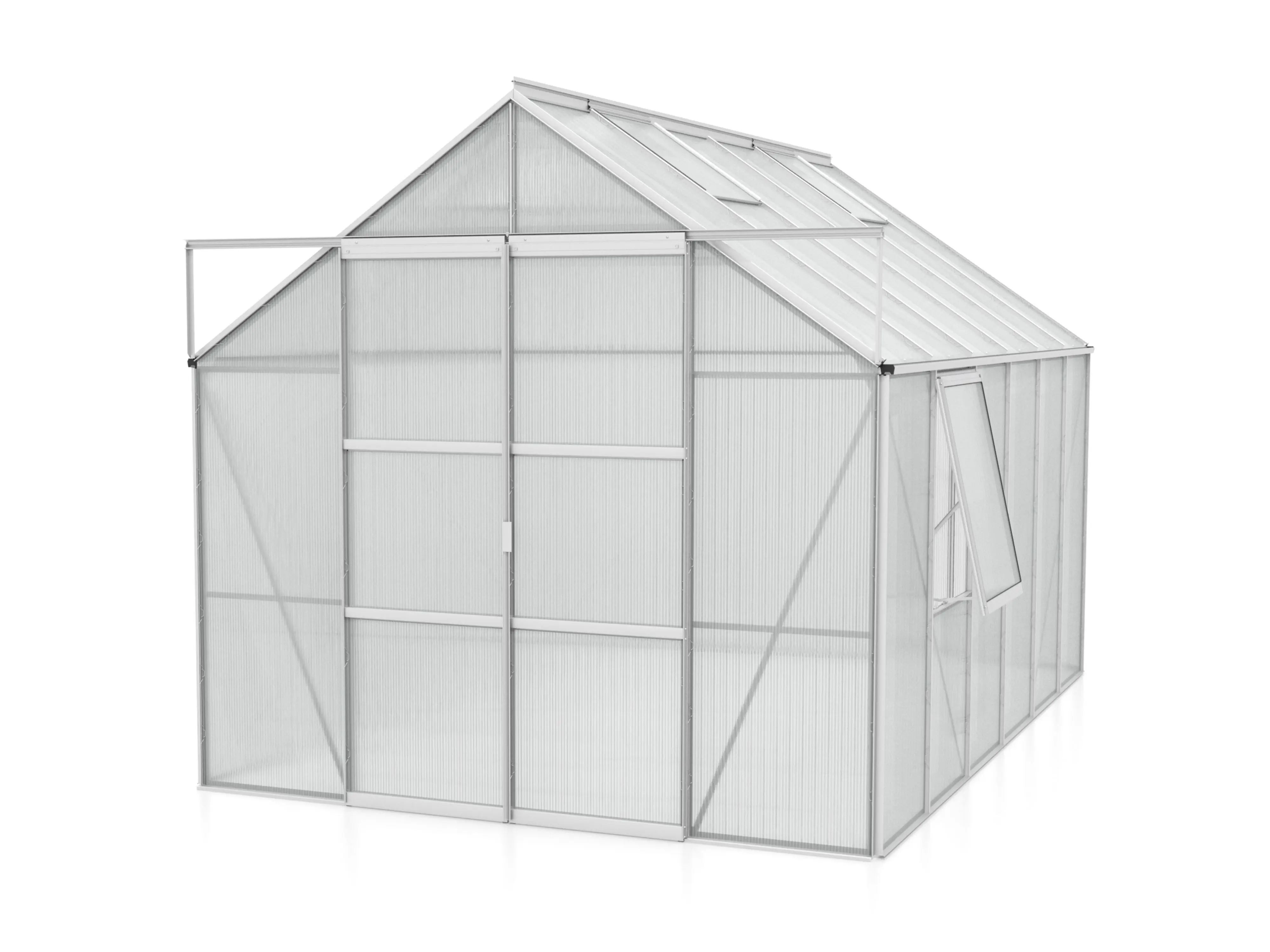 Creëer de ideale omgeving om te kweken, te zaaien en te oogsten met de ruime tuinkas Jupiter van Vitavia. Het is een topmodel uitgerust met een dubbele schuifdeur, 2 tot 4 dakramen afhankelijk van de grootte, en een extra zijvenster, elk voorzien van uitzetters om voor voldoende ventilatie te zorgen.