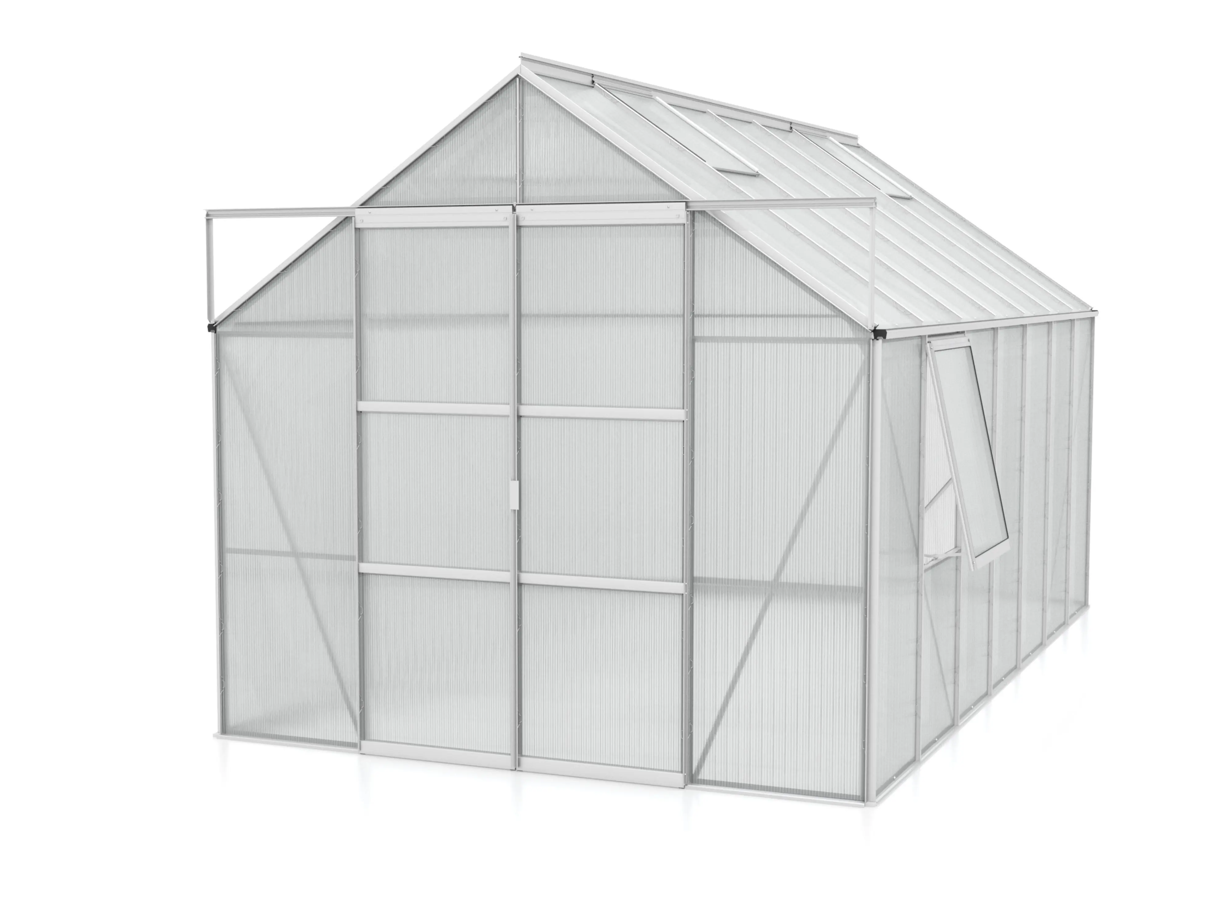 Met een royale hoogte van 248 cm en een breedte van 257 cm biedt de Jupiter meer dan genoeg ruimte. De dakrandhoogte van 154 cm zorgt voor extra stahoogte en werkgemak. Extra stevigheid wordt bereikt door hoekplaten en verstevigingen in de volledige kas, waardoor je ze zonder zorgen zwaarder kunt belasten.