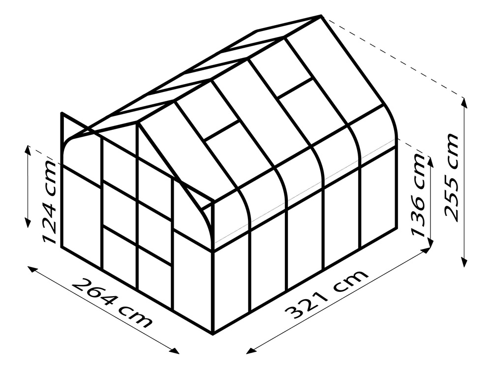 De kas is gemaakt van sterk, groen gepoedercoat aluminium en standaard uitgerust met 3 mm veiligheidsglas voor een stevige constructie en maximale lichtinval. De gebogen randen zijn afgewerkt met UV-bestendige, heldere polycarbonaatplaten. Extra praktische details zijn de geïntegreerde goten en 1 tot 4 dakramen (afhankelijk van de grootte) voor optimale ventilatie.