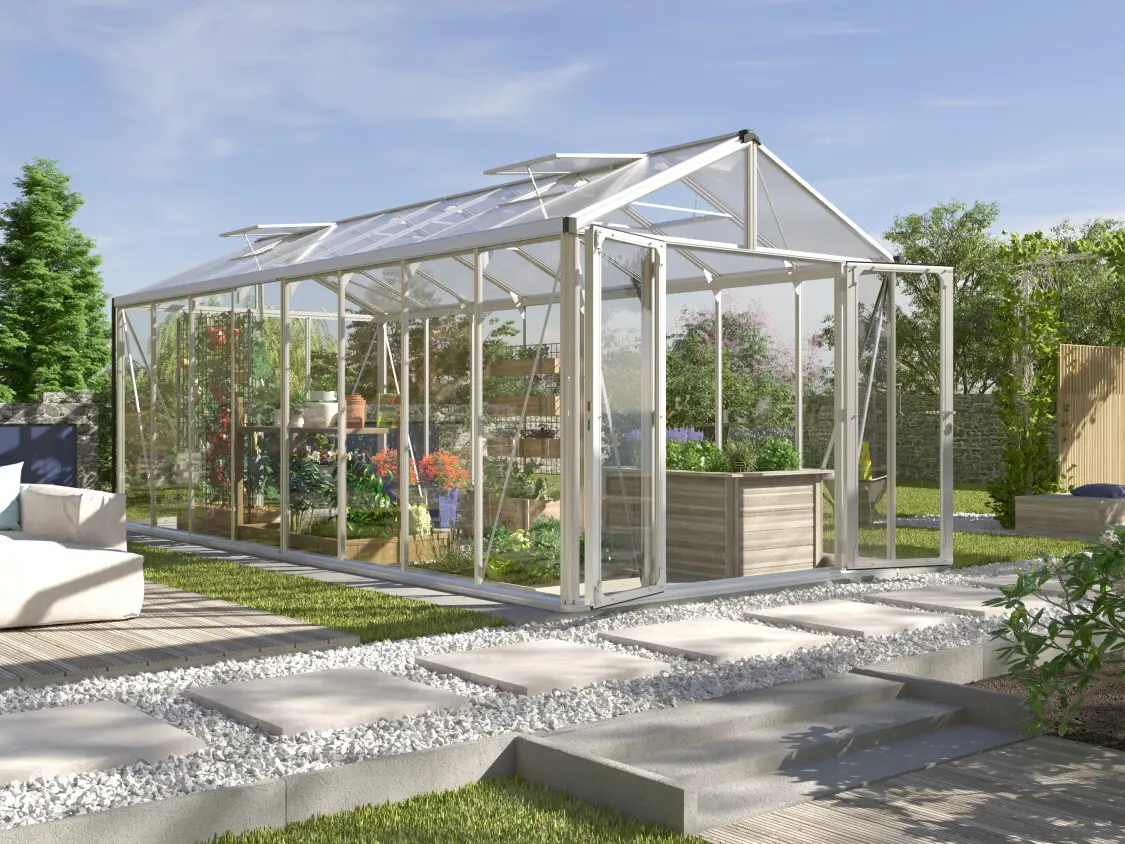 De kas is voorzien van 3 mm dik veiligheidsglas aan de zijkanten en 10 mm dubbelwandige polycarbonaatplaten op het dak. Deze platen verminderen condensvorming en warmteverlies. Het frame, vervaardigd uit geanodiseerd aluminium, is uiterst stabiel en robuust.